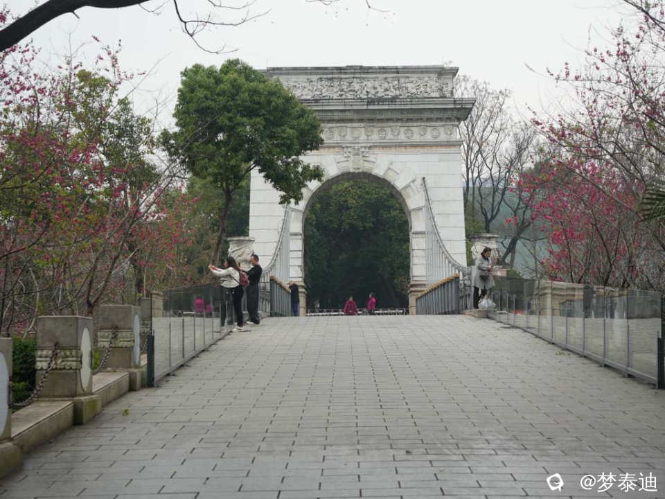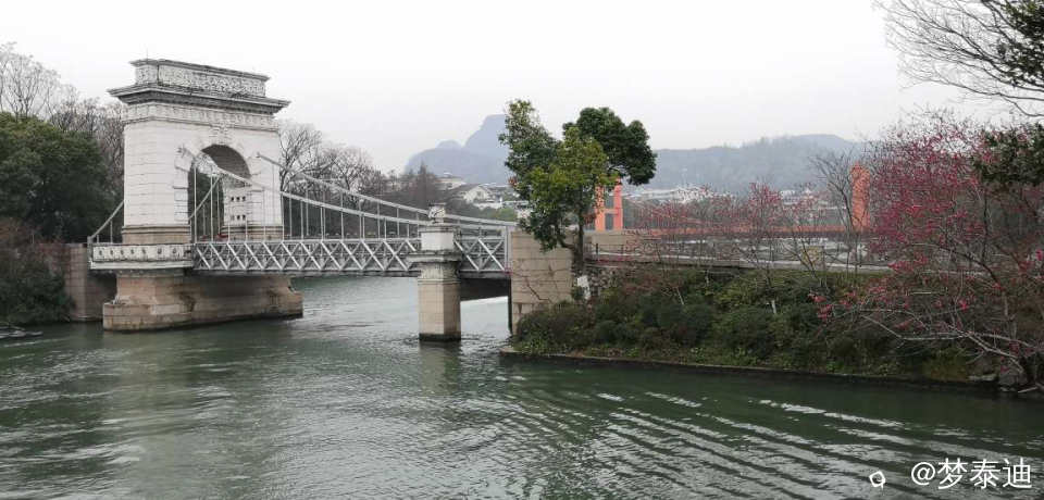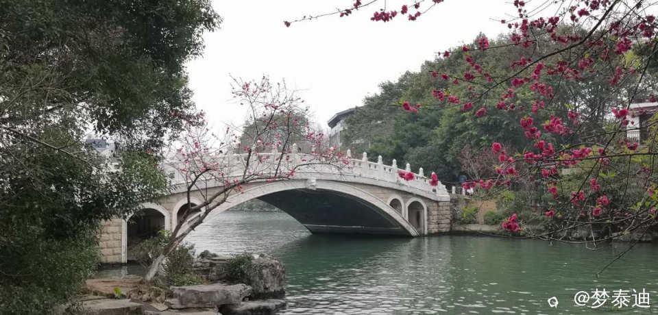 古南门前的双拱桥,在绿树成荫环绕中,有了桃花的加入分外鲜艳生动起来!
