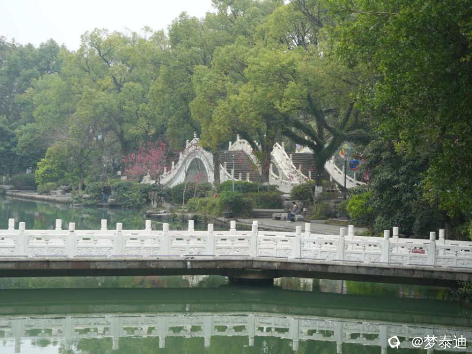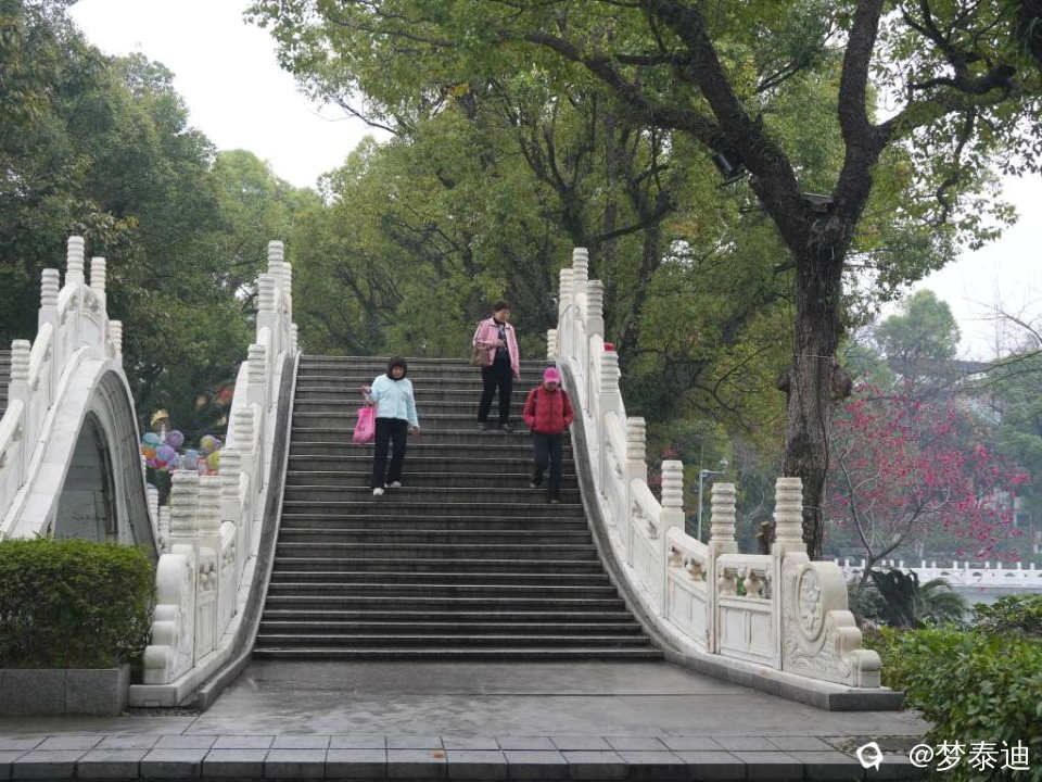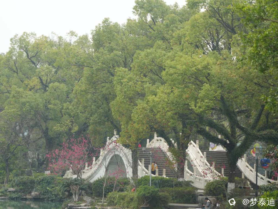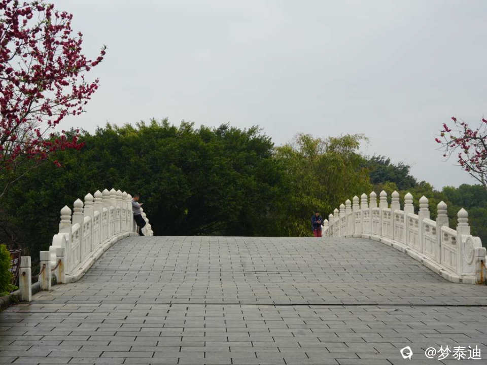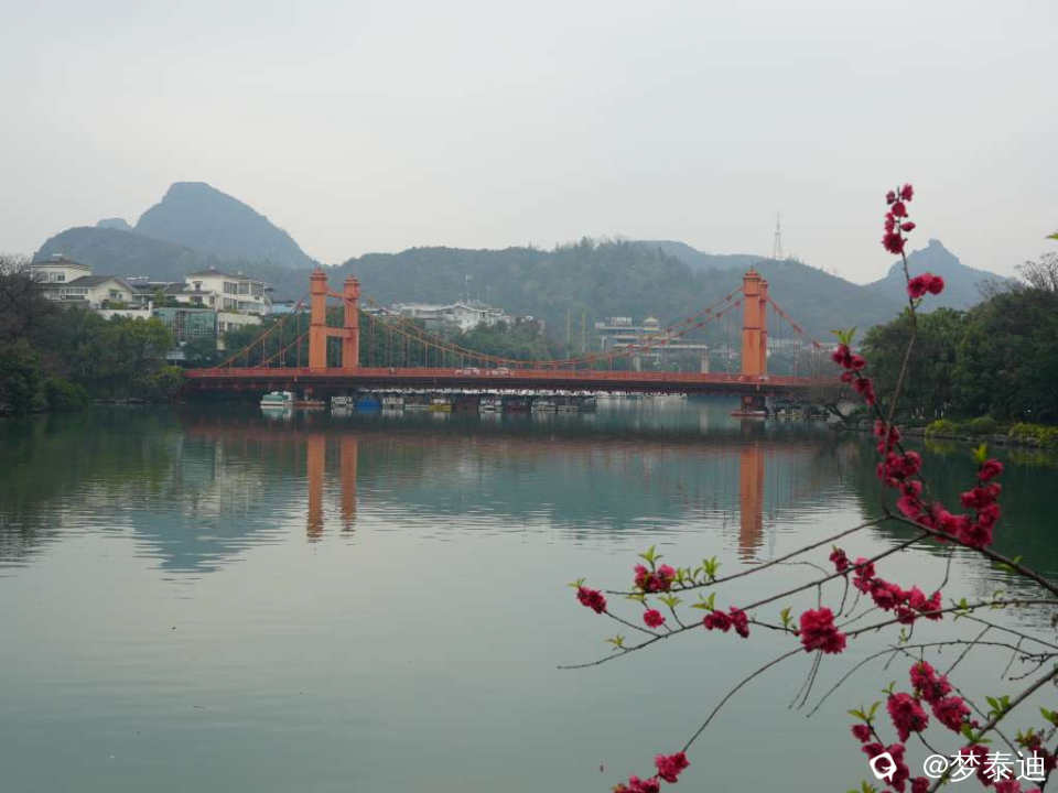 平流雾终于散了,桃花伸出头来看热闹,那一抹桃红,使湖面的九曲桥,榕溪桥顿时亮丽起来。