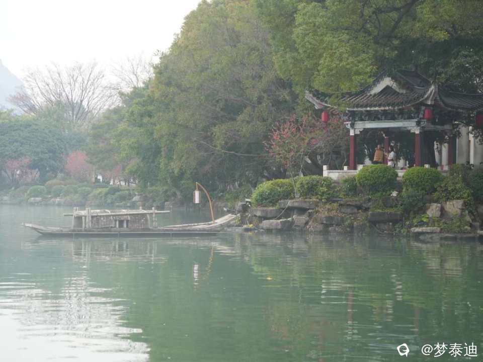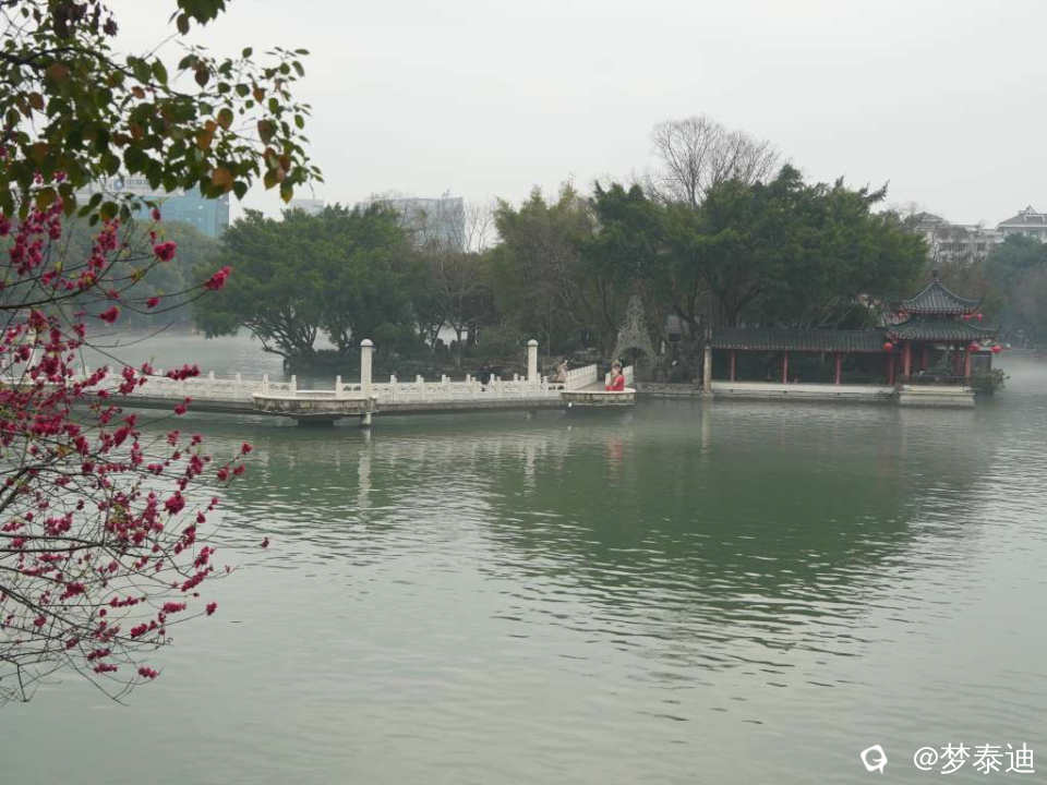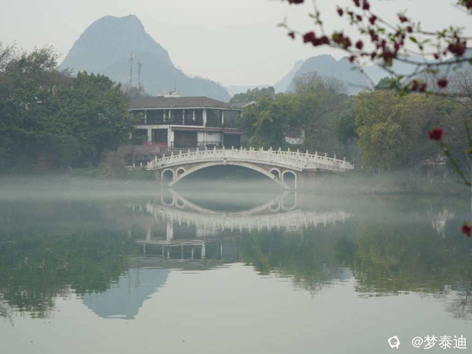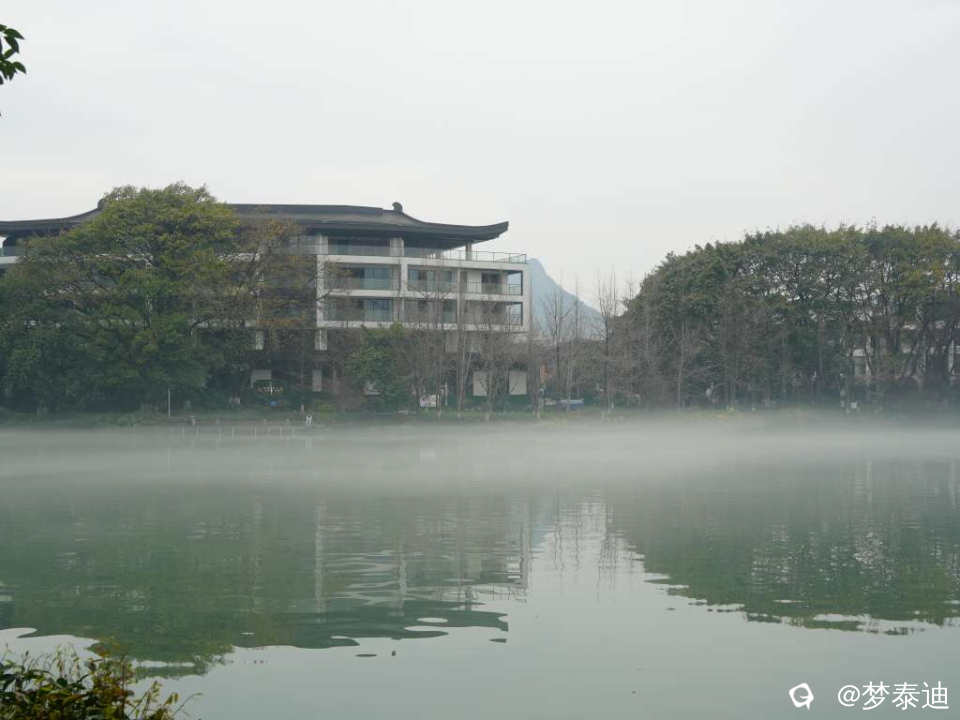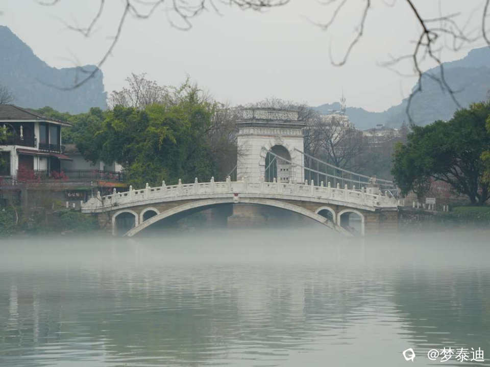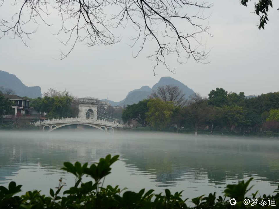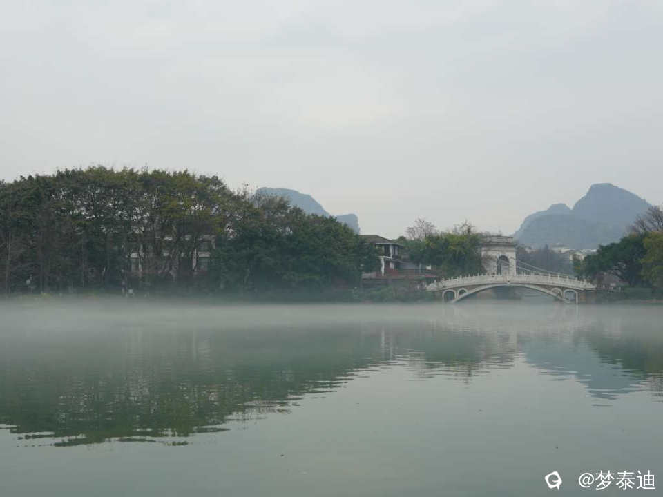 前两天漫步榕湖,惊喜地发现湖水被雾气笼罩,犹如白纱巾飘过,还以为自己看花眼,使劲揉眼睛。原来是春天的细雨南风在低温湖面形成的平流雾。眼前的青山绿水如梦似幻,云雾缭绕如入仙境,脑海中立马跳出贺敬之的桂林山水歌,在榕湖边吟唱起来。