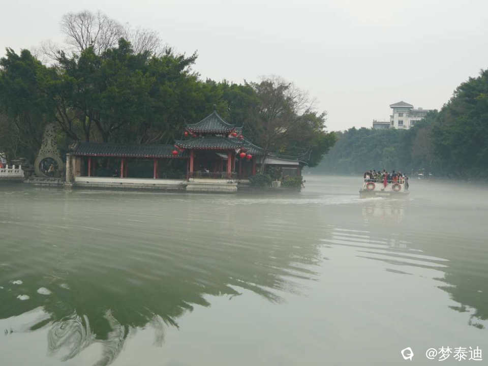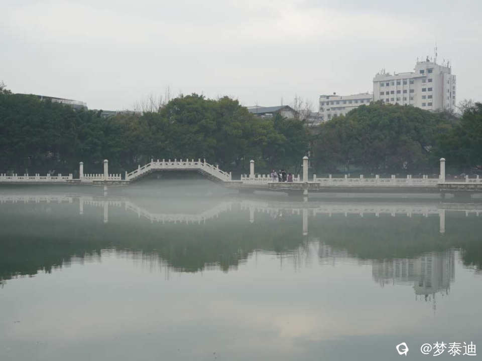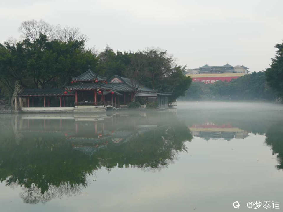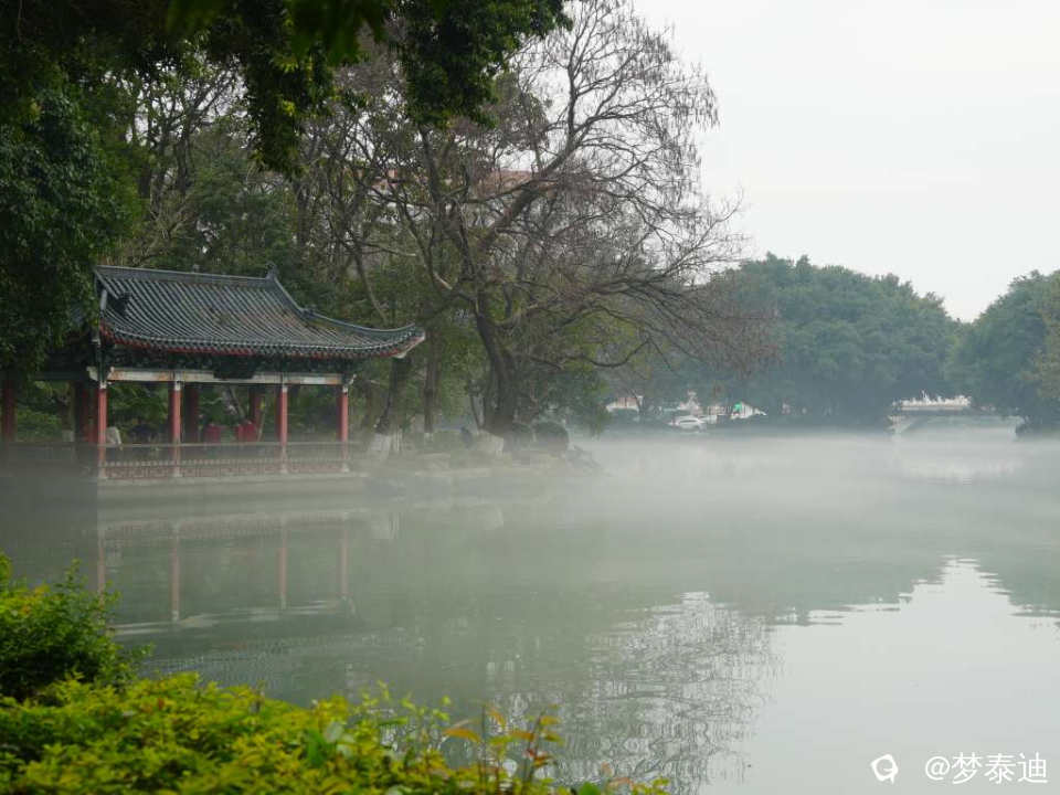 榕湖边的亭台楼阁被雾气白纱轻轻笼罩,若隐若现。刚才在亭中打太极的人们,远观一招一式如嫦娥舒袖,美不胜收!