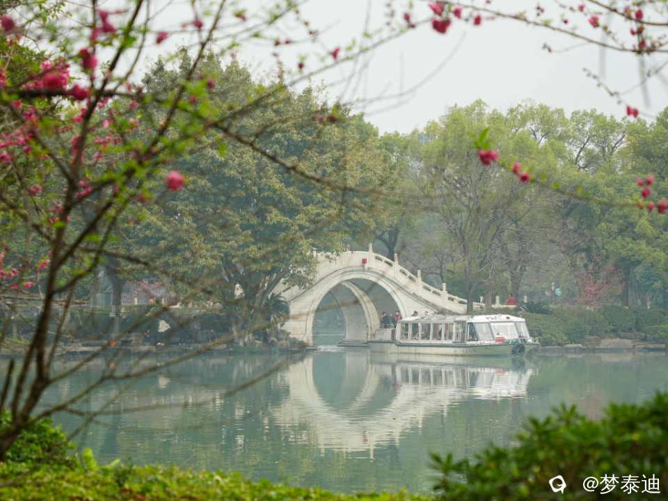 一声鸣笛,从石拱桥下开出一艘春天的游船。