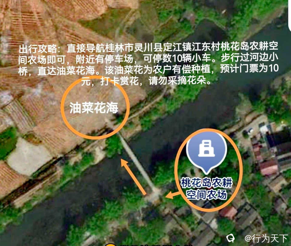 出行攻略:直接导航桂林市灵川县定江镇江东村桃花岛农耕空间农场即可,附近有停车场,可停数10辆小车。步行过河边小桥,直达油菜花海。