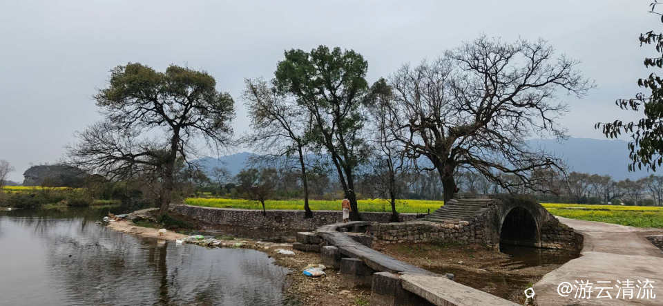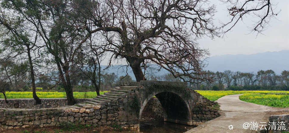 古桥横卧碧溪前,老树虬枝探晓天。