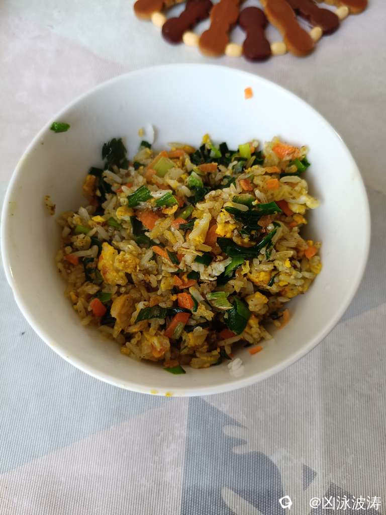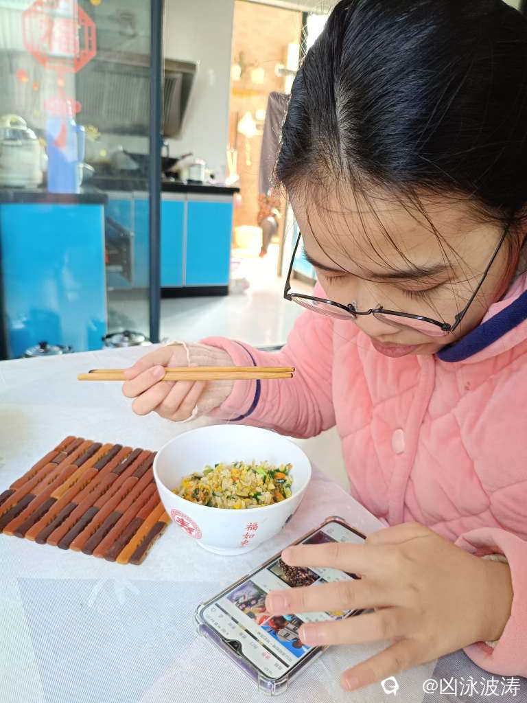 人到中年了,回想青春过得那么快。下班回家发现白冰箱里有一碗中午的剩饭,就炒一餐扬州炒饭吧当今晚的晚餐吧,本想偶一个人吃。但是偶身体不好,不能吃一碗饭。悄悄的问声小女儿吃吗。她很高兴,假如偶老了,动不了她还会炒饭给偶吃吗,虽然她很不听偶的话,毕竟她是偶的女儿,虎毒不食子。与她共餐也是一种幸福吧