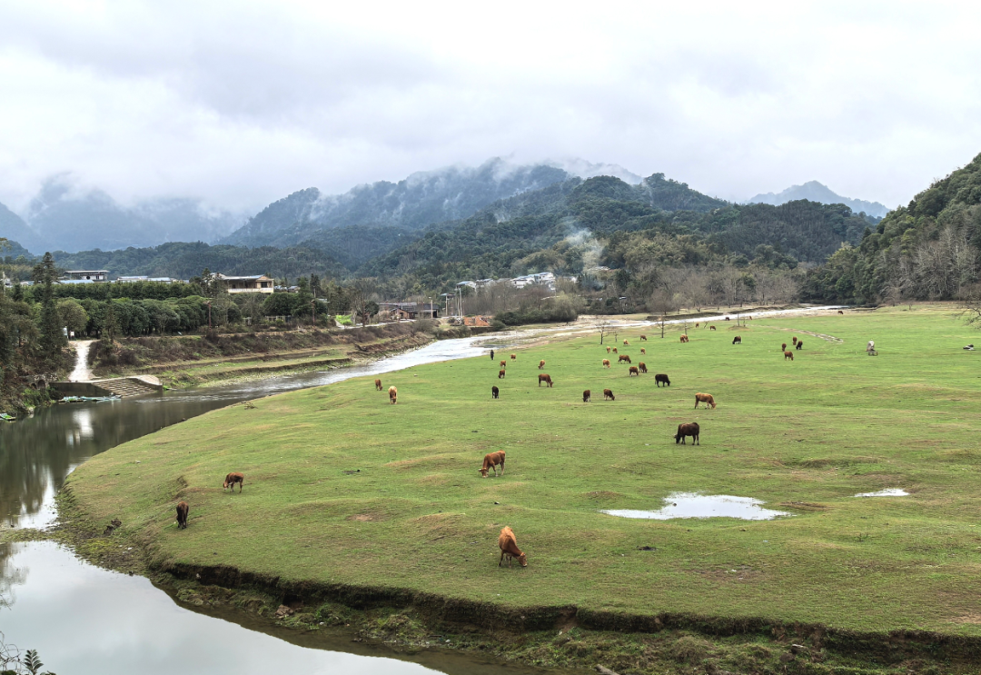 顺着村路绕着山边走,山边是最普通的农村景色,田里种有菜花、窝基笋、大白菜、芥菜、葱花等农作物,及篱笆、女人、狗,或许还有那延续了几千年恒古不变的人文故事……