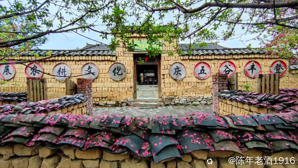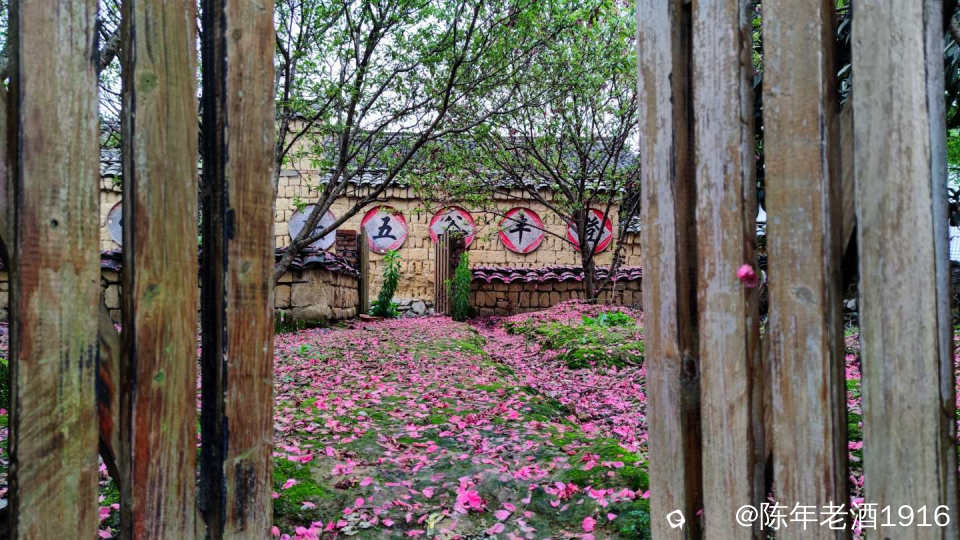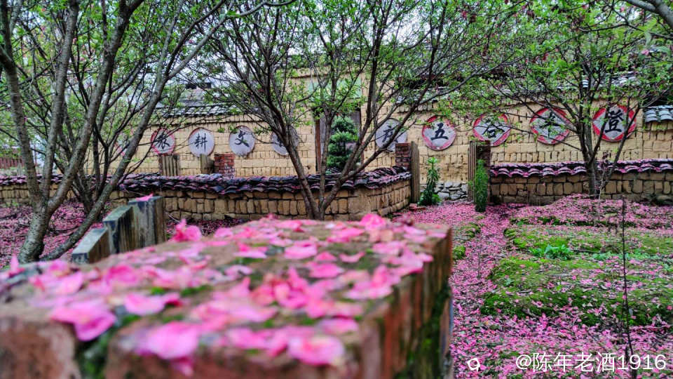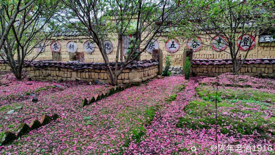 夜里一阵狂风春雨过后,周六早上路过四塘下舍里村(之前也来过,下舍里村环境优美,一步一景,随处可见栩栩如生的廉吏画像、生动有趣的先贤事迹、令人警醒的清廉标语,一幅幅清廉画卷映入眼帘),看到路边竹篱笆下铺满了粉红色的桃花瓣,正如诗句“夜来风雨声,花落知多少”。潜意识里回想起村里的“农耕文化展示馆”屋前有一小片桃树林,此时此刻也应该是层层叠叠铺满的一地桃花瓣吧,于是寻迹而入......