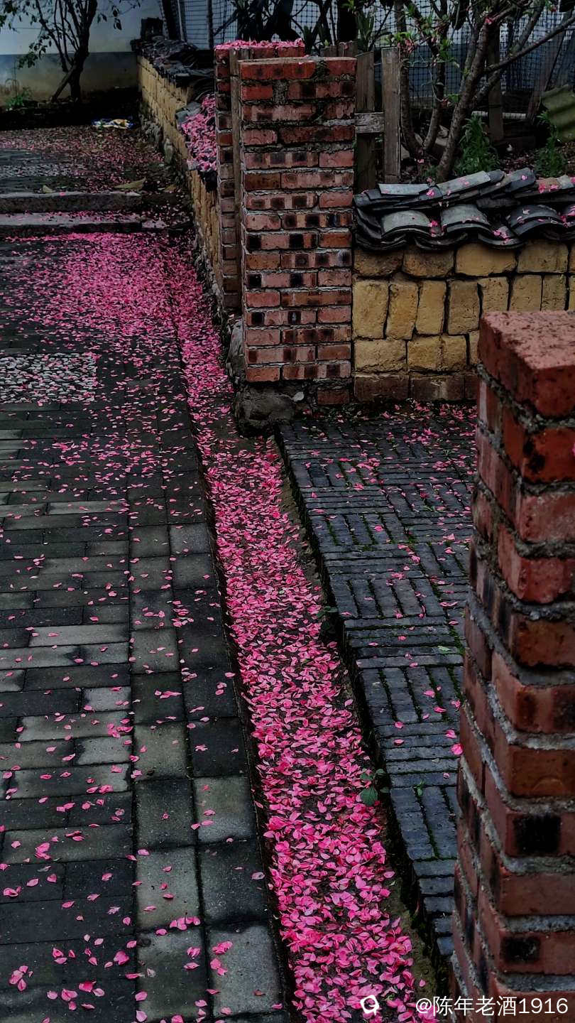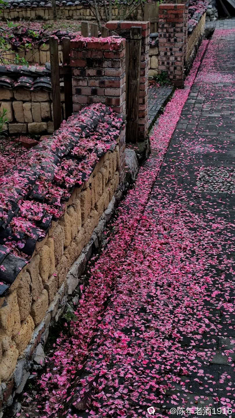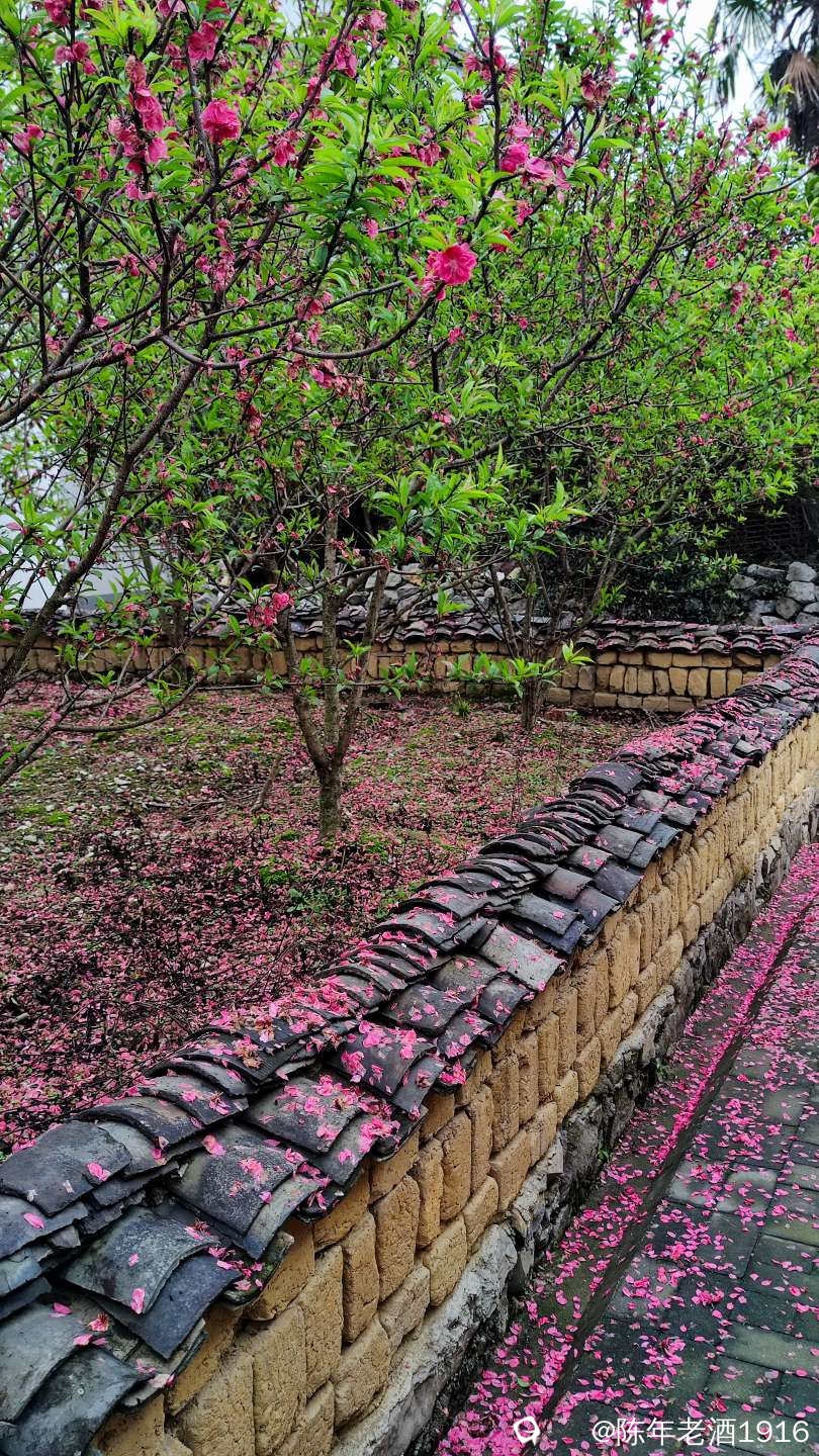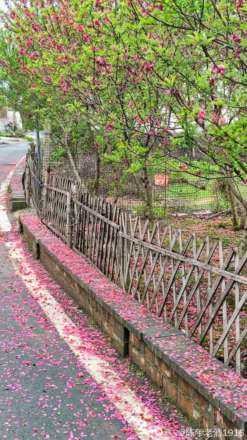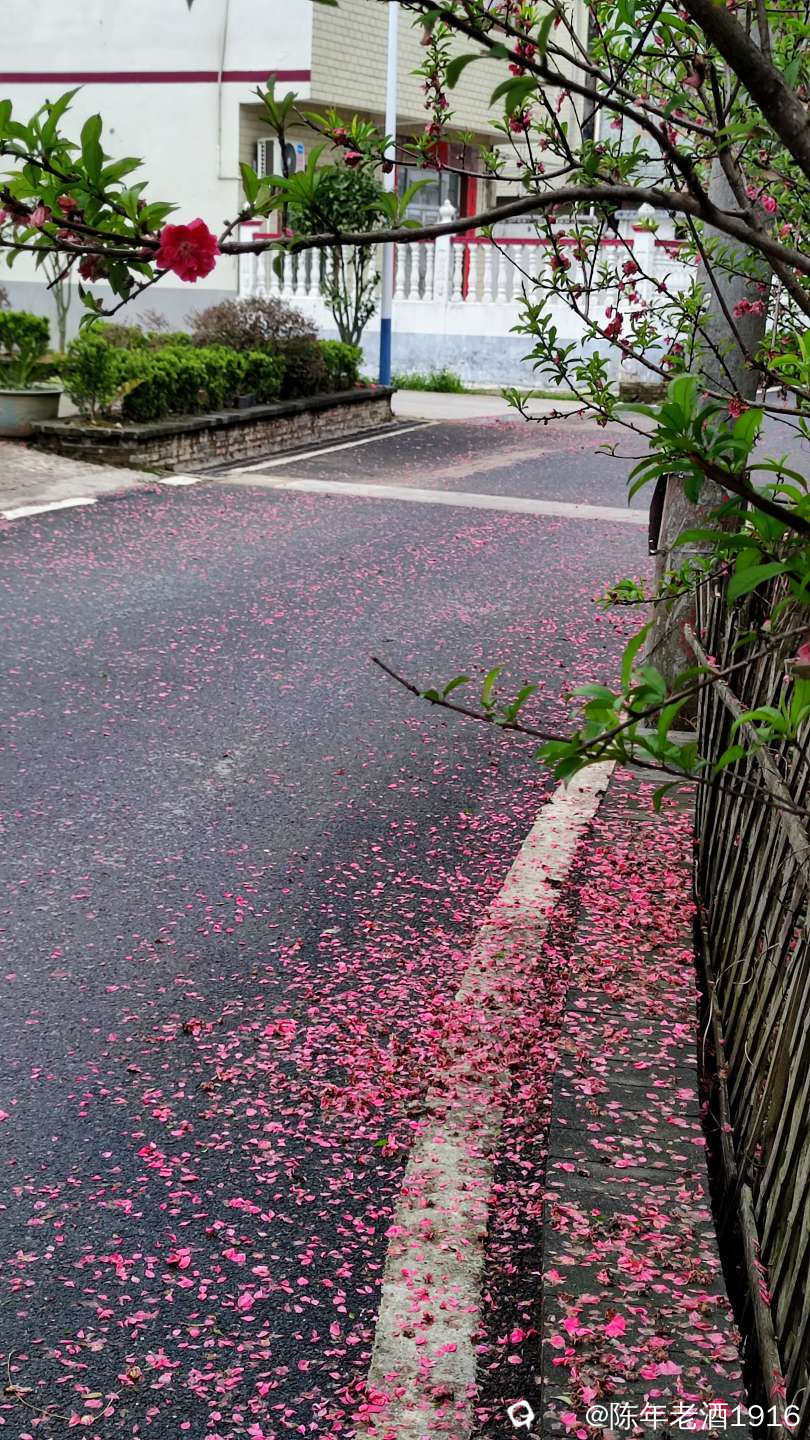 沿着村巷直直走了数十米,果不其然,转角处的小巷、小院的围墙上及院内的桃树下如先前预料的被昨夜春雨打落的粉红色桃花瓣,犹如铺了一层“胭脂毯”,装扮出无以言表的美感,小心翼翼地走在花毯边,生怕踩出印痕打扰了这浑然天成的场景。尚带着湿润的甜香,偶尔有随风飘落的花瓣嵌在花毯里,并很快融入其中,瞬间分辨不出哪片花瓣是刚飘落的。沾了夜雨的落花格外绵软,被风推着往墙角及小沟里挤,让出路面生怕被路人踩踏而失去“容颜”