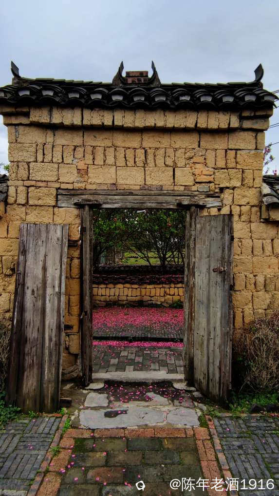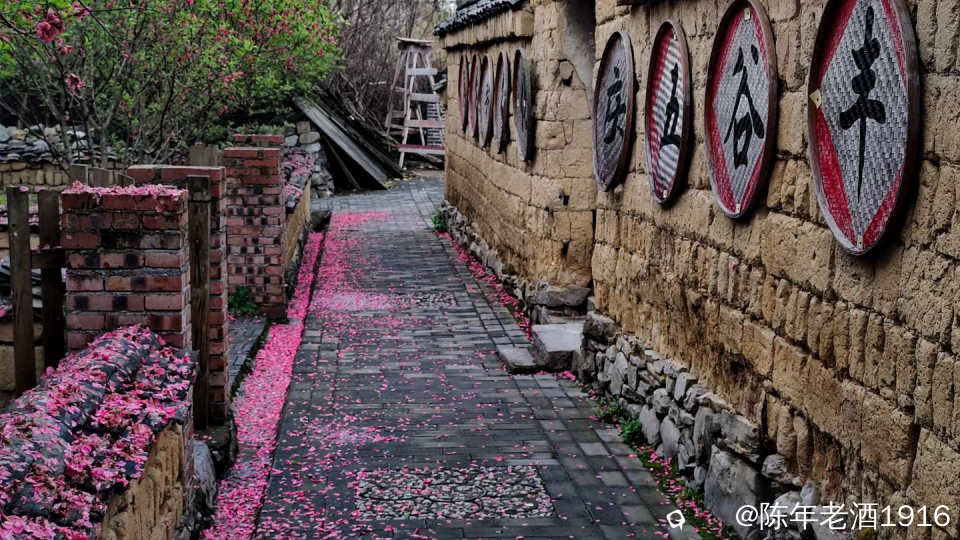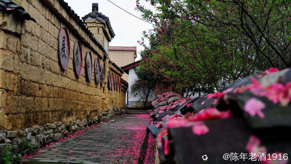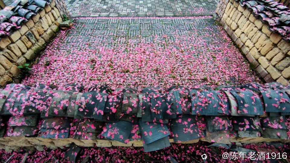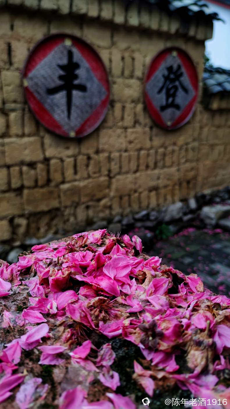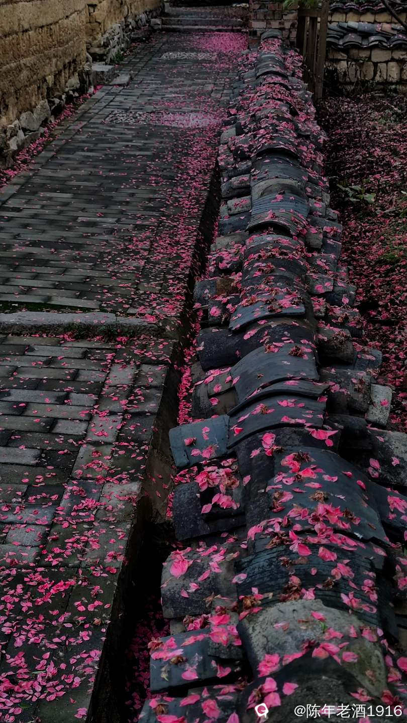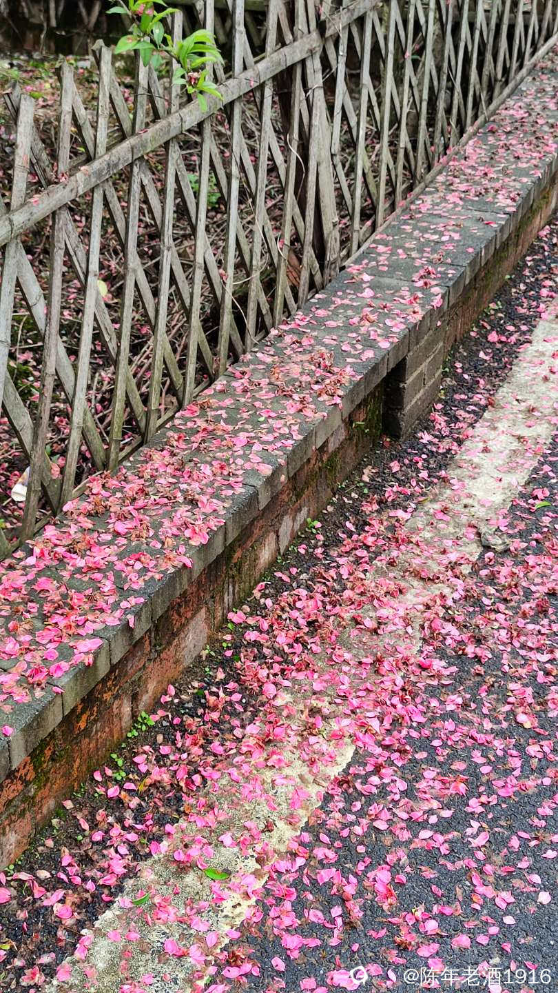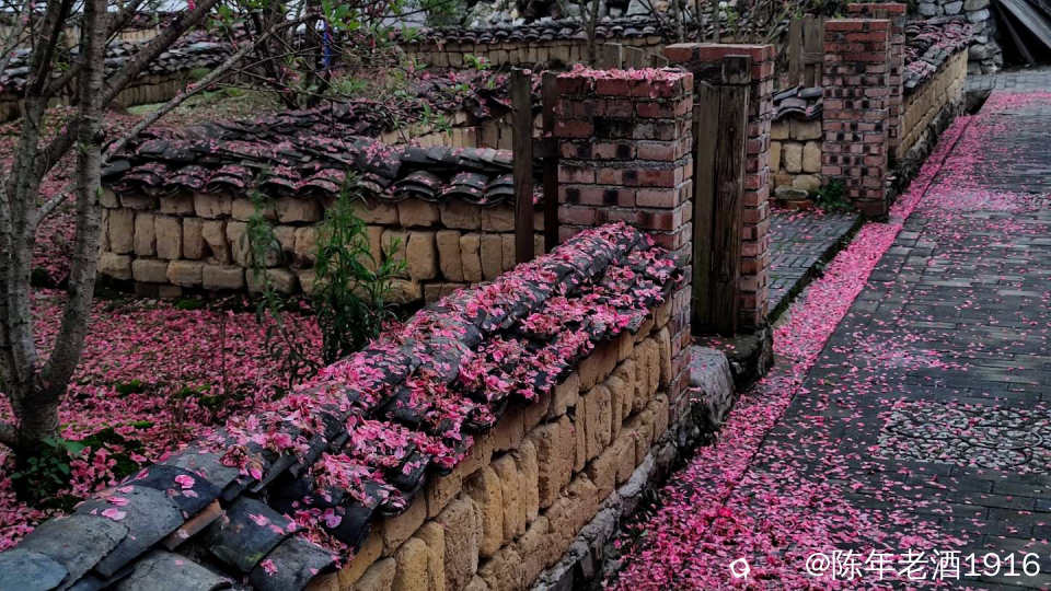 沿着村巷直直走了数十米,果不其然,转角处的小巷、小院的围墙上及院内的桃树下如先前预料的被昨夜春雨打落的粉红色桃花瓣,犹如铺了一层“胭脂毯”,装扮出无以言表的美感,小心翼翼地走在花毯边,生怕踩出印痕打扰了这浑然天成的场景。尚带着湿润的甜香,偶尔有随风飘落的花瓣嵌在花毯里,并很快融入其中,瞬间分辨不出哪片花瓣是刚飘落的。沾了夜雨的落花格外绵软,被风推着往墙角及小沟里挤,让出路面生怕被路人踩踏而失去“容颜”