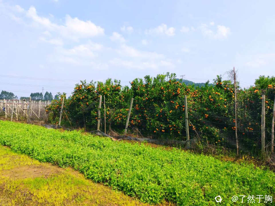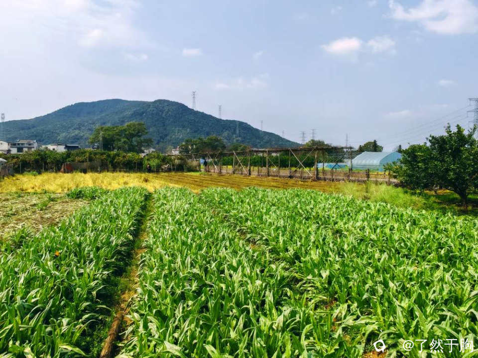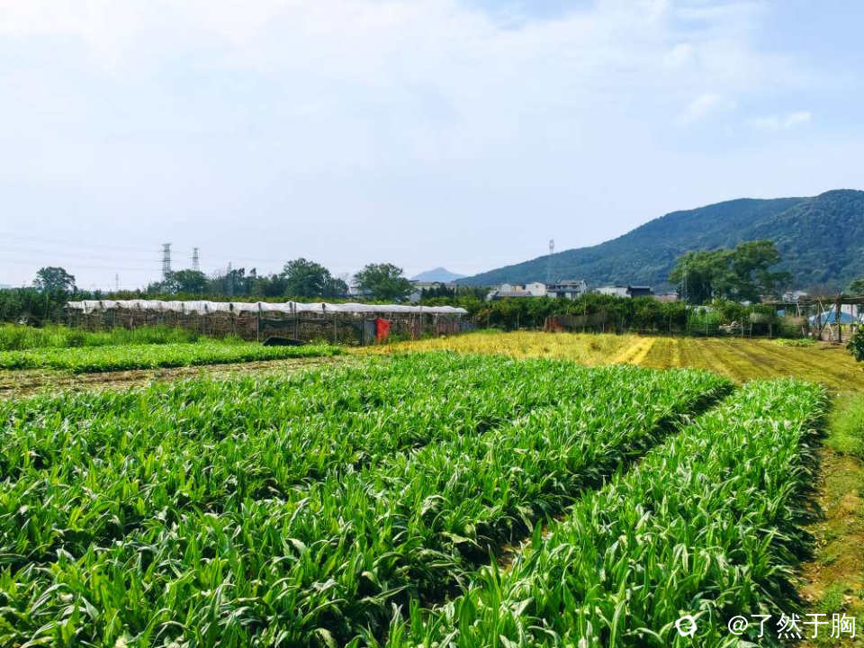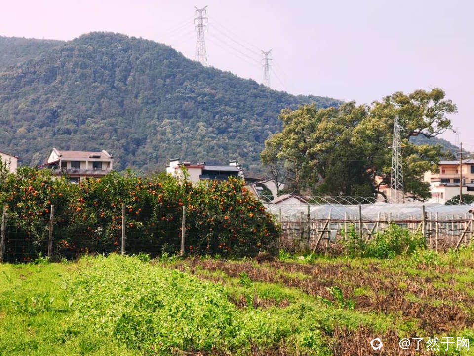 村北面与甘棠江之间的田野里,金黄的菜花没有了,但碧绿的青菜正茂盛,橘黄的柑橘依旧硕果累累,各葡萄,草莓等的大棚之间,田地里或绿草如茵,或残存的油菜花,蚕豆花等,组成一幅幅色彩斑斓高低和谐的田园图。