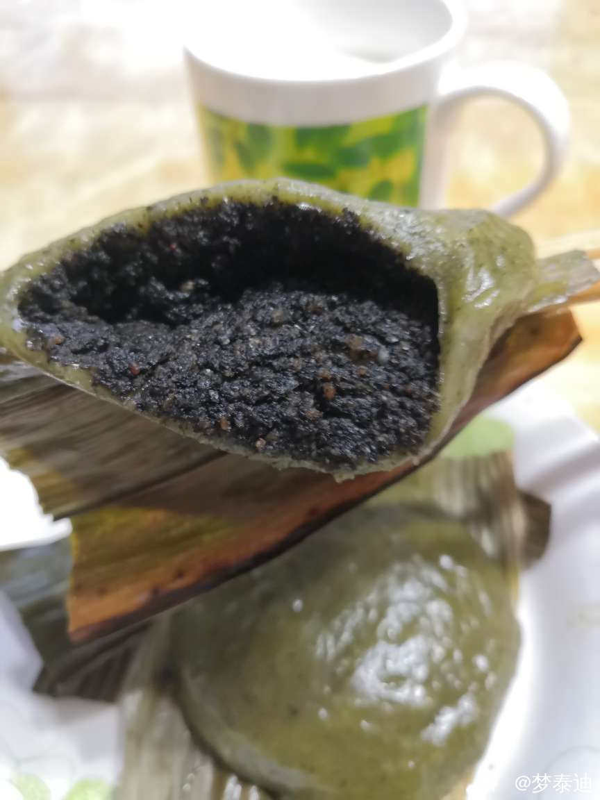 市场艾叶粑有两种口味,甜的是香香的黑芝麻;咸口味的是粗犷的花生馅。