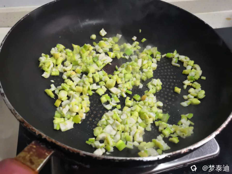 春笋煎蛋也是春天才有的美味哦。春笋用刀拍破后切碎,放油翻炒断生后调味,倒入放盐后的鸡蛋液。