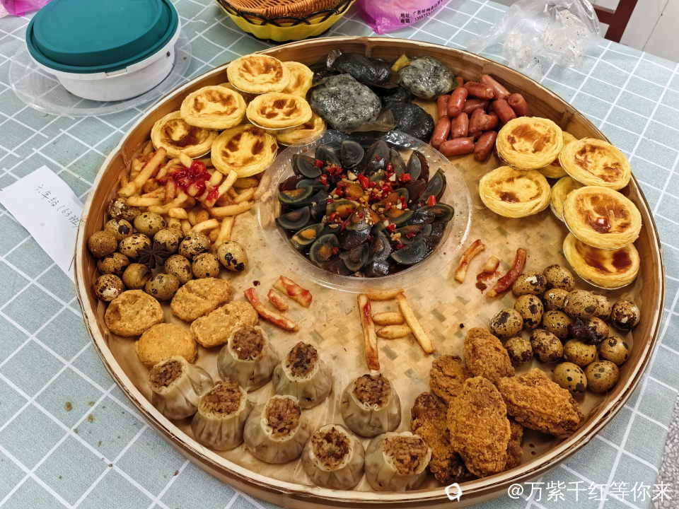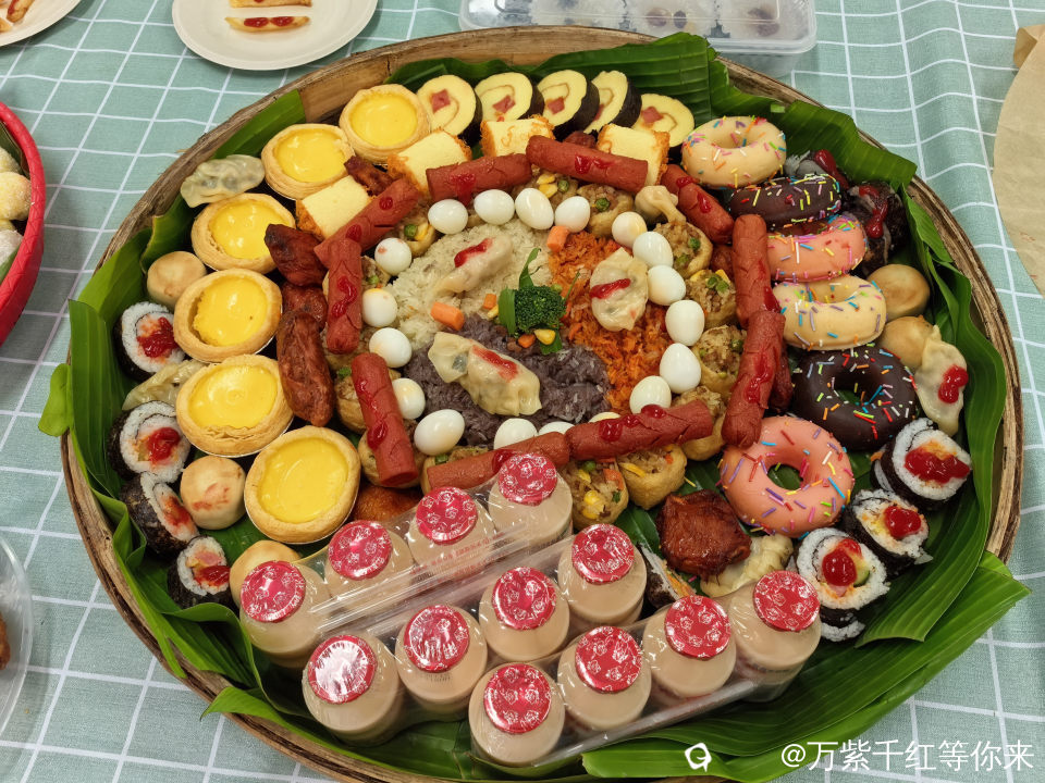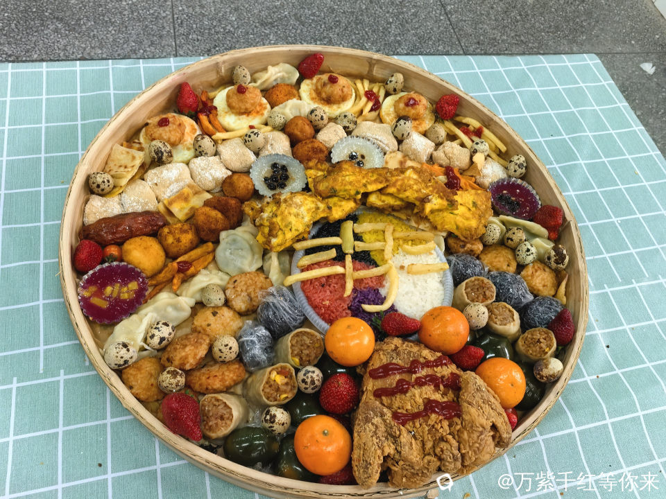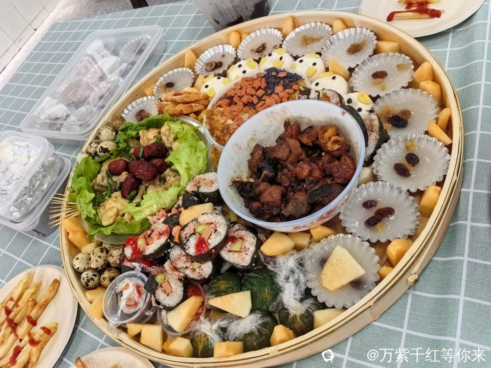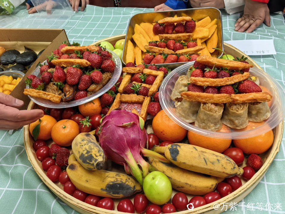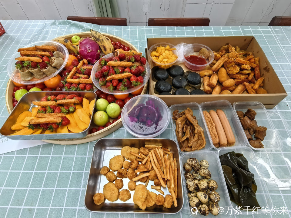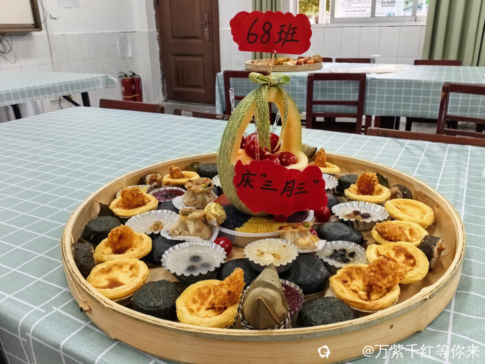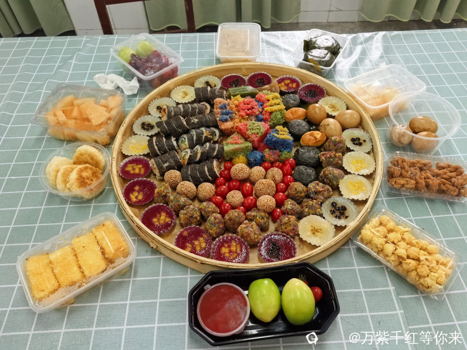 三月的春风,飘着糯米饭的香味和清新的果香钻进了校园;那糯米饭如同绽放的五彩花海,还有艾叶粑、粽子、炸红薯、薯条、鸡腿、凤爪、鹌鹑蛋、火腿肠,面包蛋糕各类小吃,及新鲜的草莓、小西红柿、青枣、香蕉、火龙果等数不胜数,琳琅满目的小吃摆满课桌上;看着这五颜六色的拼盘,真心为家长学生们鼓掌,你们太用心了!
