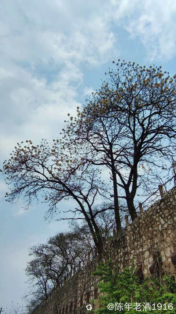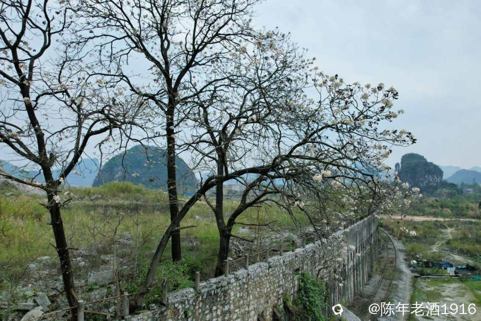 这里尽管只有几蔸泡桐树,但由于它们所处的地理位置特别,长在7-8米高石墙荒野之上,枝条向下蜿蜒曲折,枝条上长满了白色的花朵,完美的曲线更显婀娜多姿,让人联想翩翩。石墙下方是当年运输石料的列车铁轨,如今已经废弃多年。而与这个场景更为点睛的是,远处那座特别抢眼且让人极具想像的山,站在通往老街的立交桥上,试着从不同机位给泡桐花和那座山来个合影,瞬间觉得这画面似乎灵动起来......