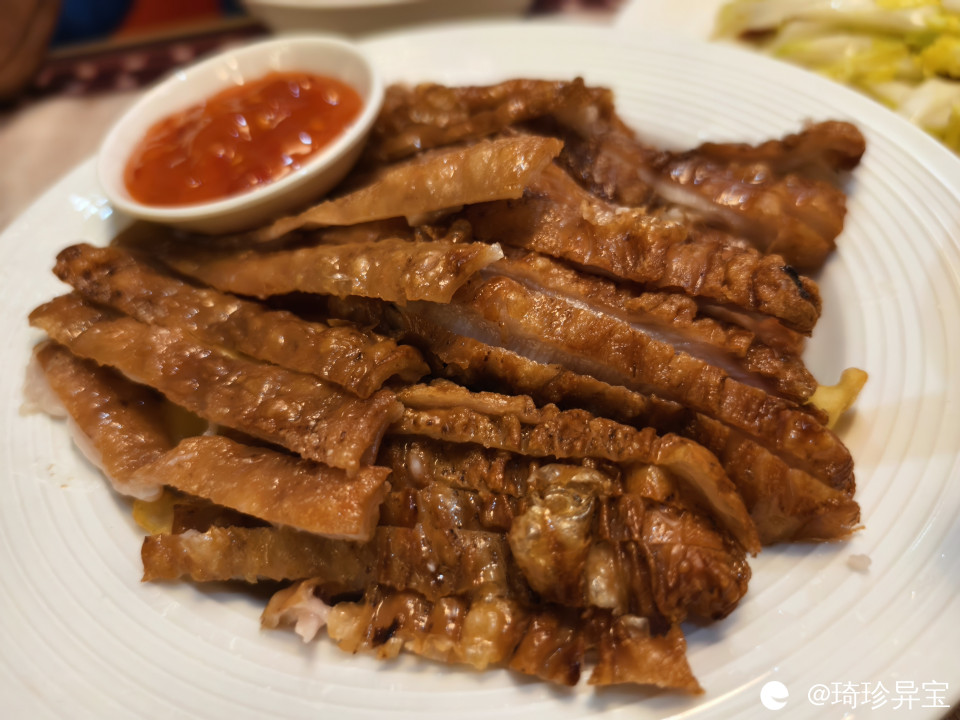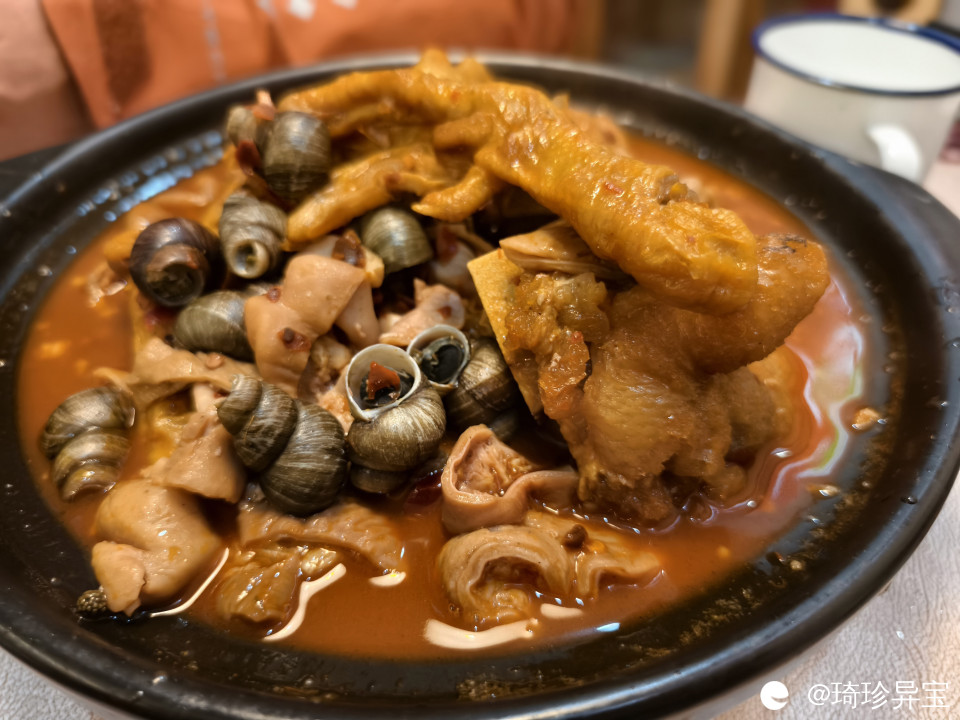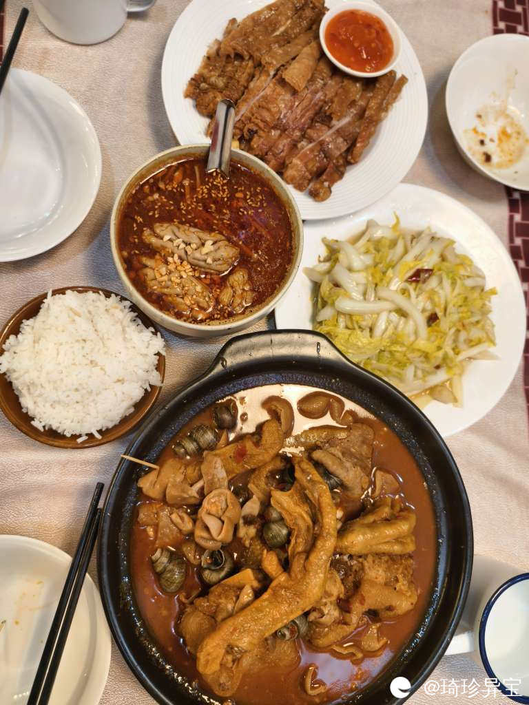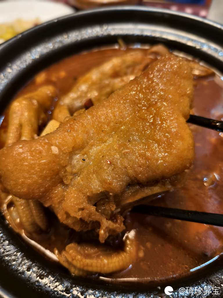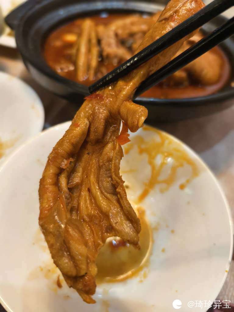 烤猪脑有点辣如果不吃辣的人就不要点了,不过味道很好。脆皮肥肠一定要趁热吃冷了就会有一点腻。鸭脚煲里面的料子还是很多的猪蹄就大大的两块,里面的螺狮也很好吃很甜。可是我们实在人太少菜太多没有吃完好浪费啊。