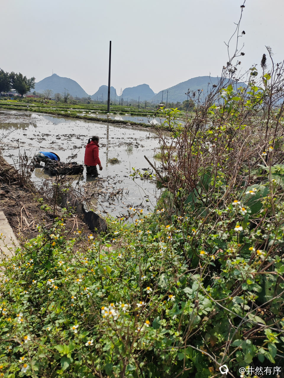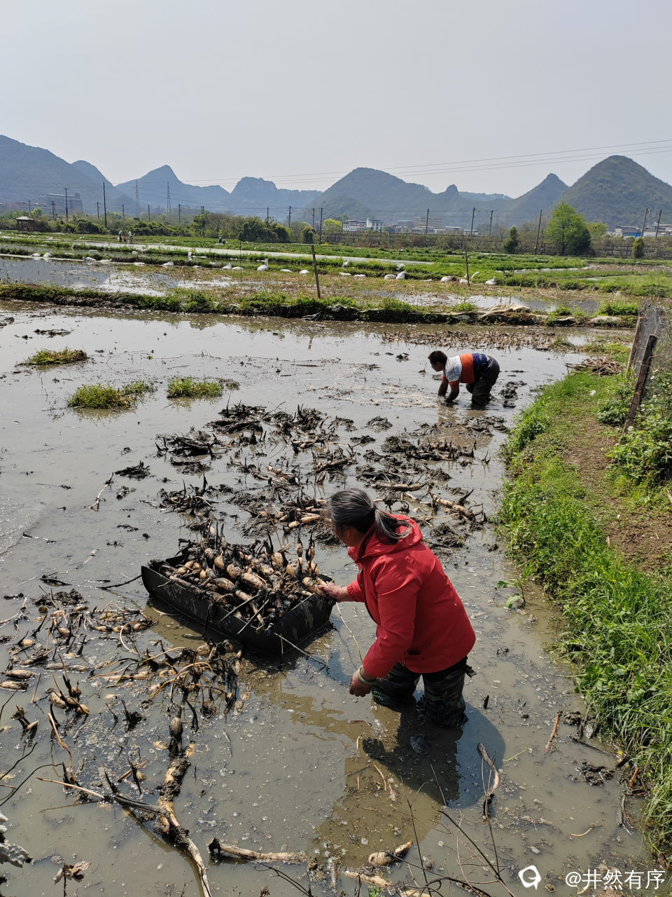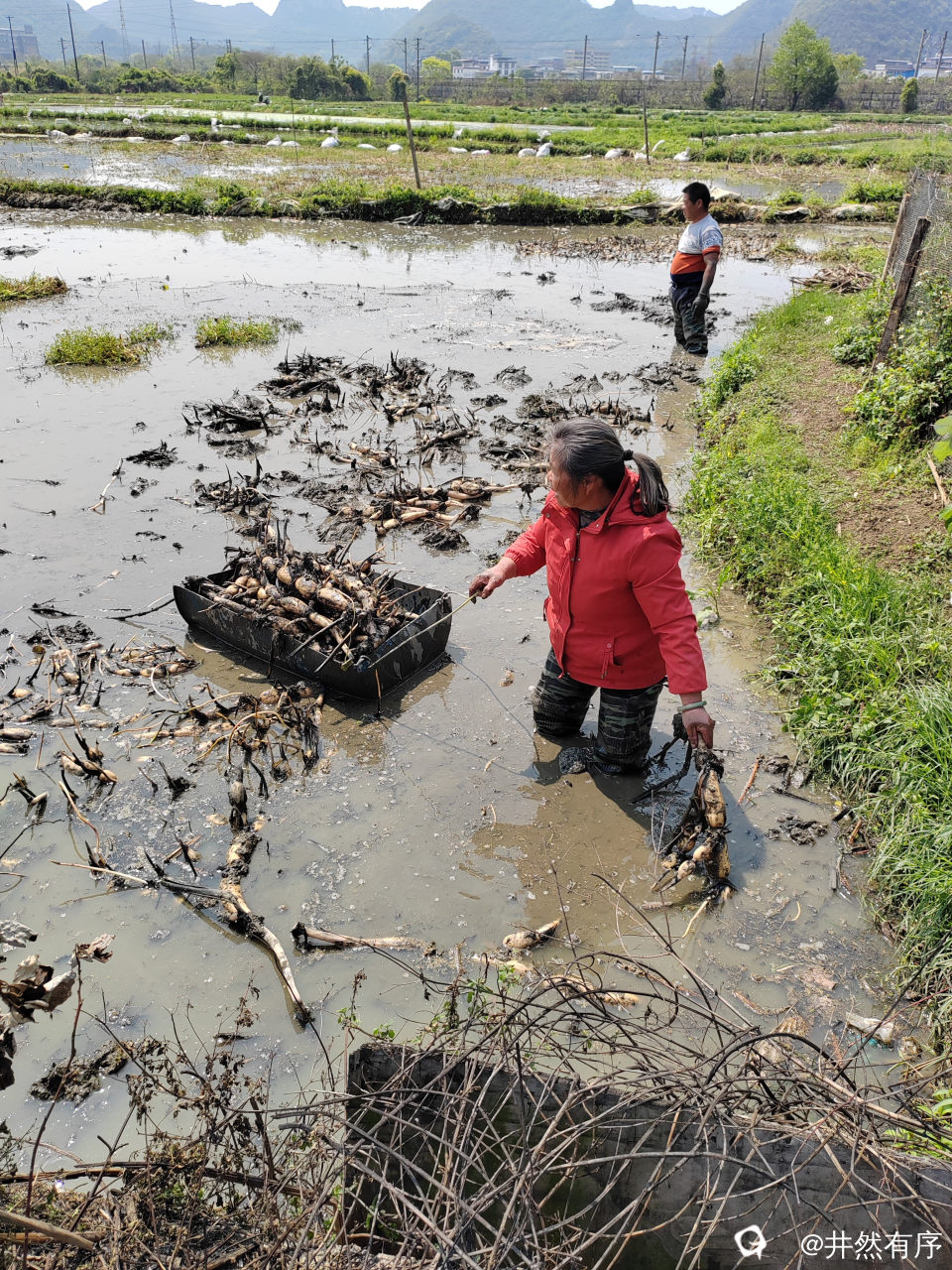 村民们在田间地头辛勤劳作,挖莲藕,种莲藕同时进行。