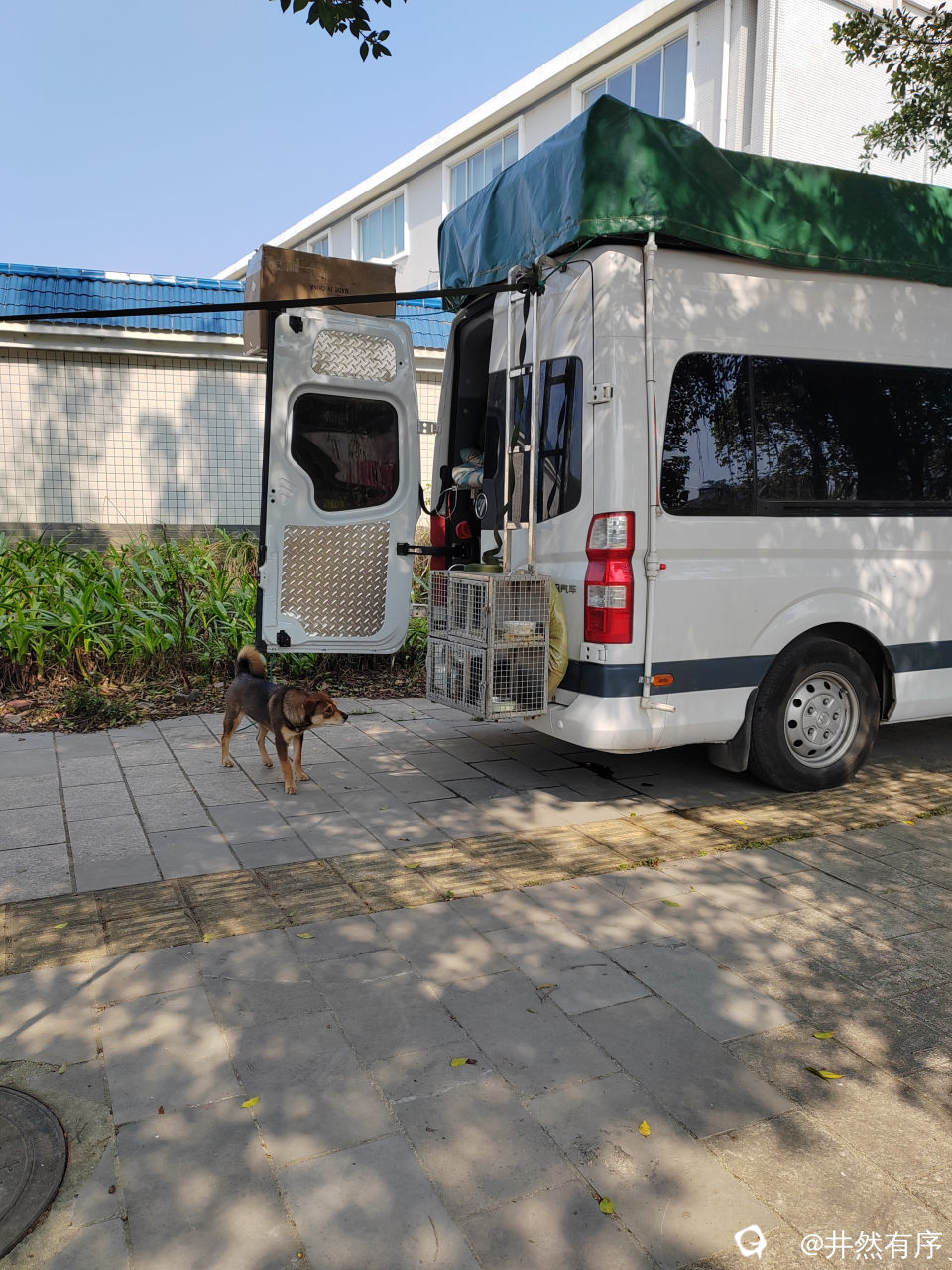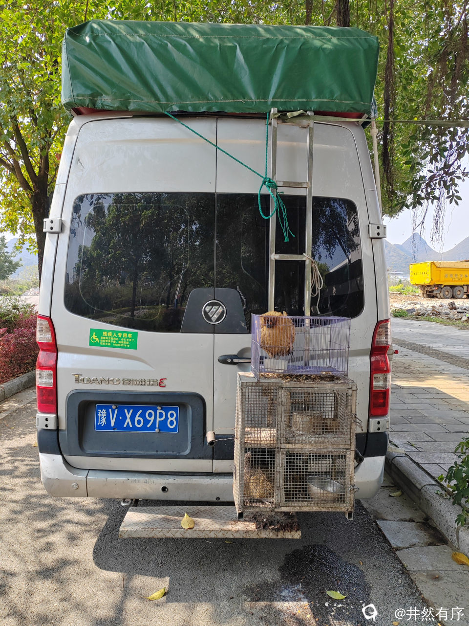 吃饱喝足就踩单车去琴潭村溜达。路边停着两架外地房车,一辆车后面还挂有鸡笼,一辆后面挂狗笼,真是麻雀虽小,五脏俱全,汪汪还蛮乖,出来活动看见生人拍照它也不乱叫,还挺配合。