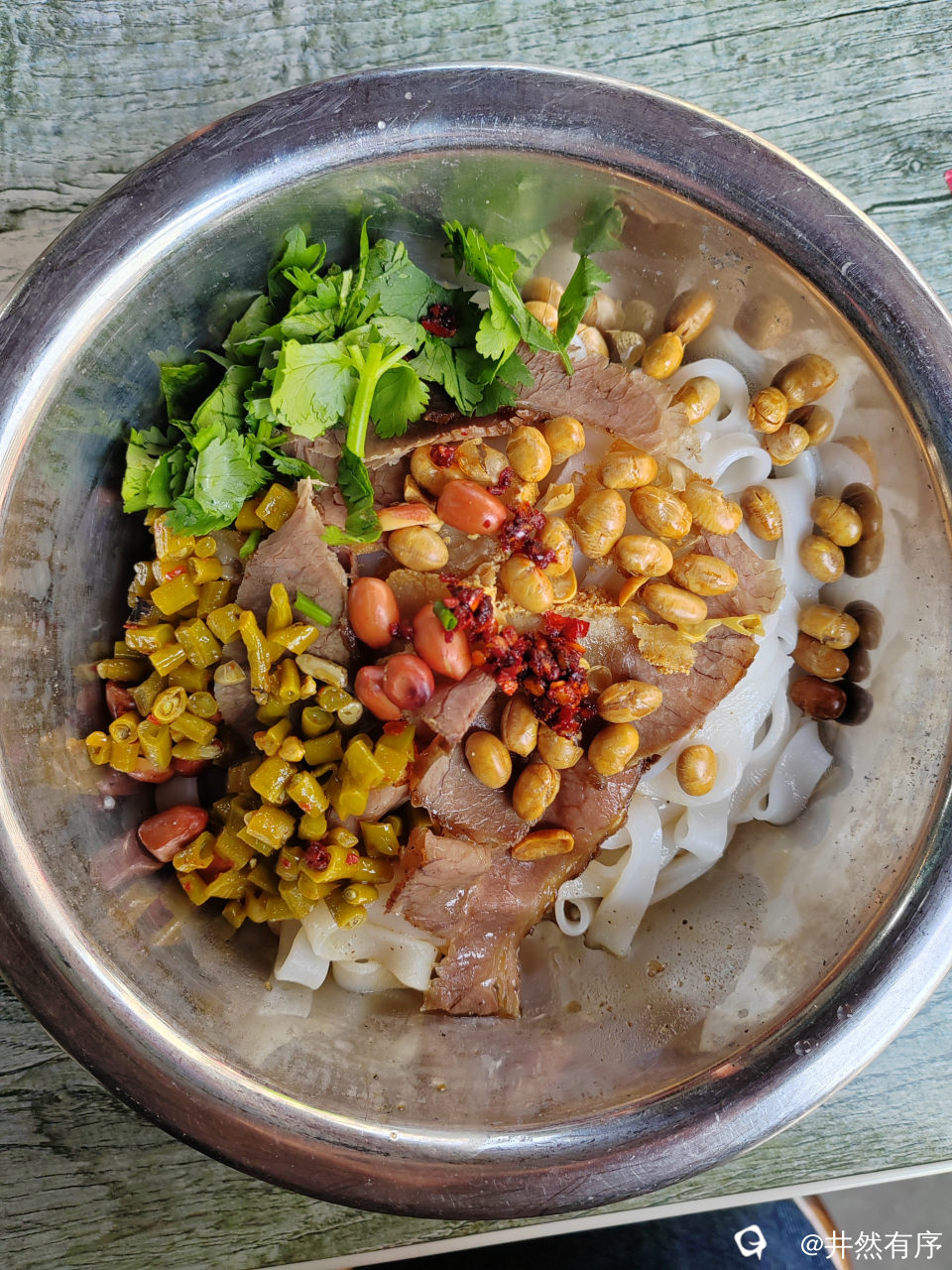 这才是嗦米粉的正确打开方式,他家的豆子是正宗的油炸黄豆,不象有些米粉店用弯豆代替,以往下米粉的都不问要不要花生,今天放好黄豆后,她问要不要花生,当然要了,然后放好佐料,嗦粉开始。