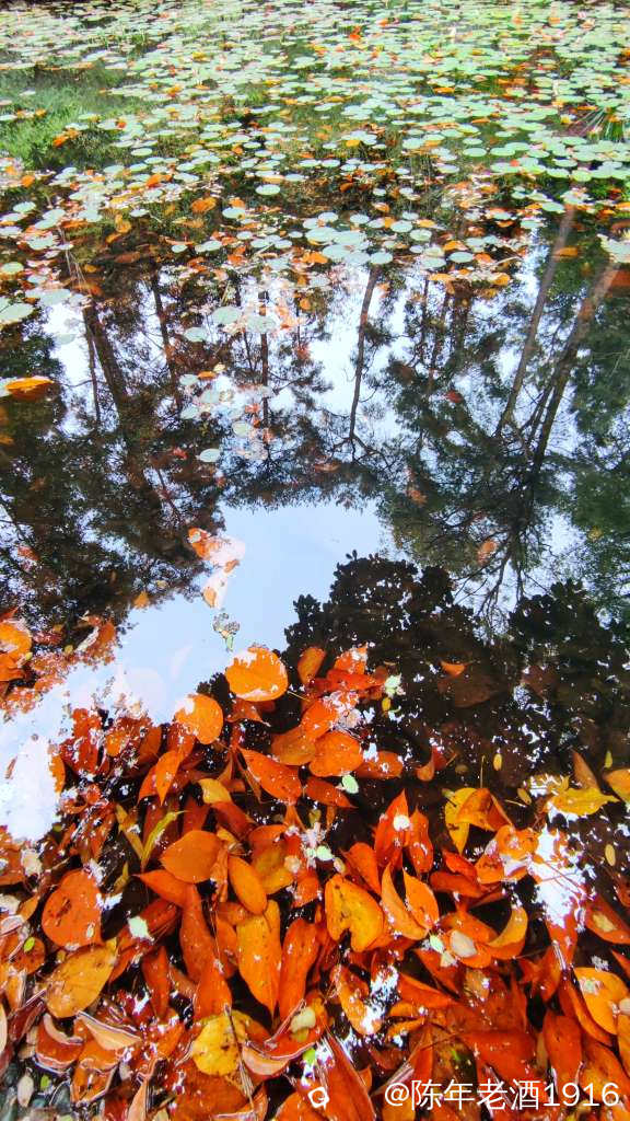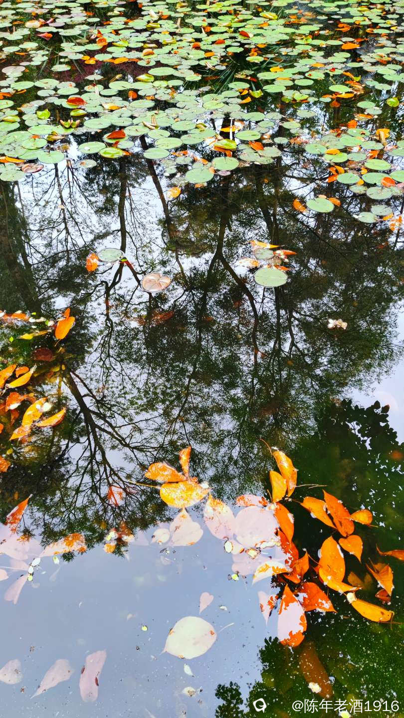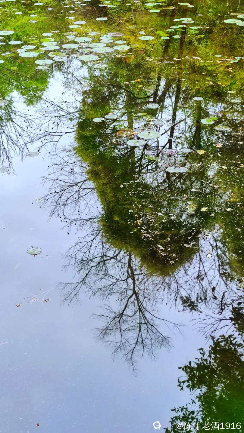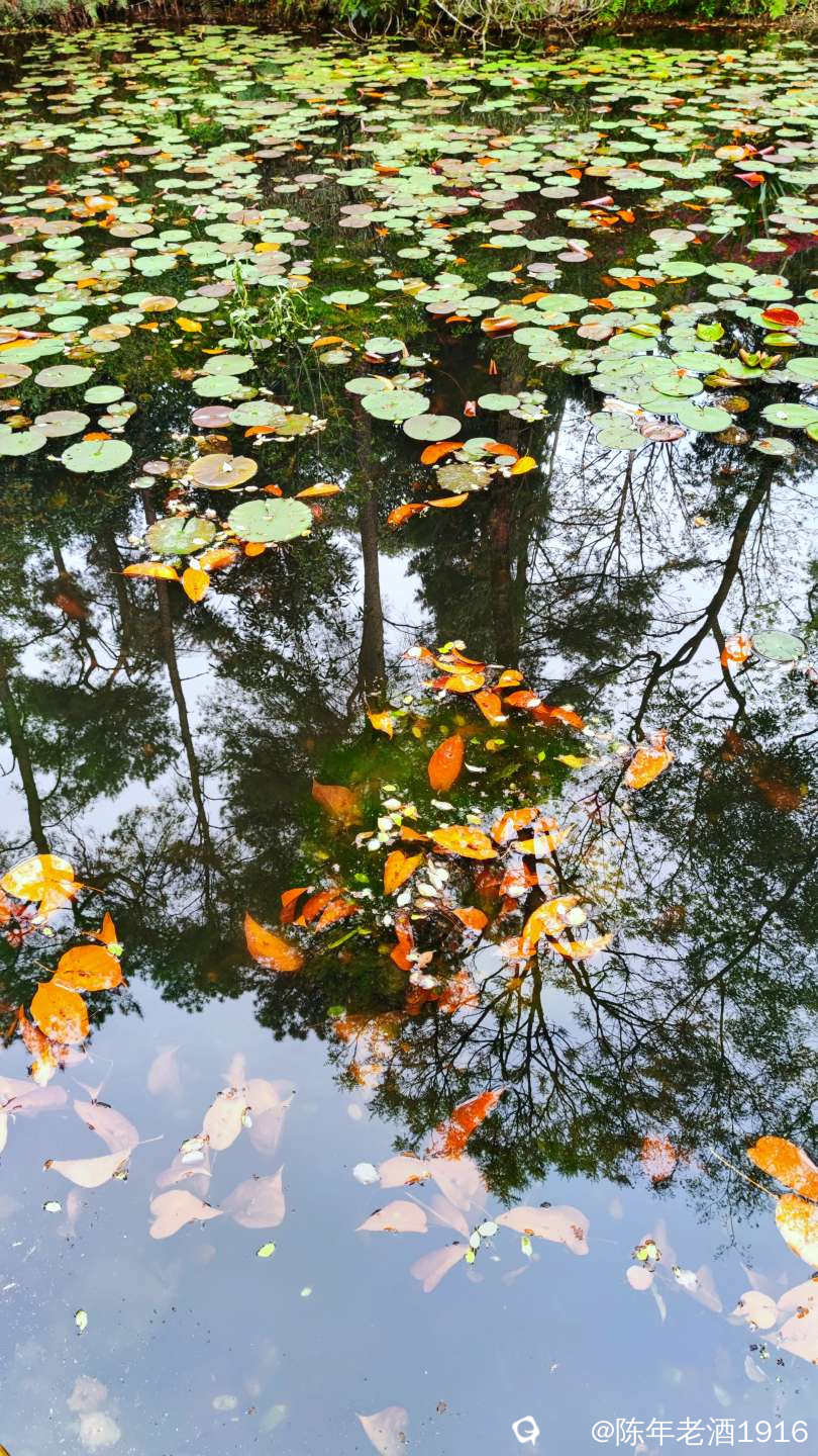 目之所及皆是风光,都说偶尔抬头望望就会有意想不到的好风光,而在这里,低头看看一汪池水,也会收获五彩斑斓的好风光。水面飘浮着绿色的睡莲叶和金黄色的落叶,与水平如镜的树林倒影,构成一幅幅色彩斑斓的油画和水彩画。