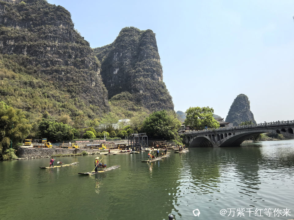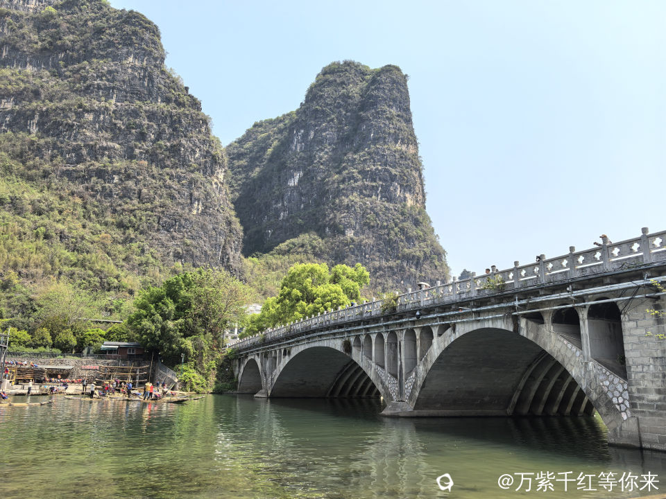 站在阳朔遇龙河工农桥下,只见眼前群峰起伏,山水相映;竹筏穿梭不停,遇龙河的竹筏总是那么火爆。我每次来阳朔,都必到工农桥打卡。整个遇龙河两岸山清水秀,如诗如画的湖光山色,让人赏心悦目。