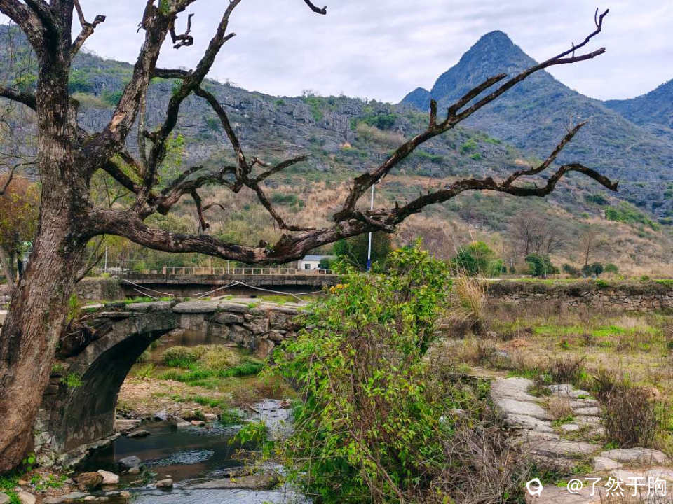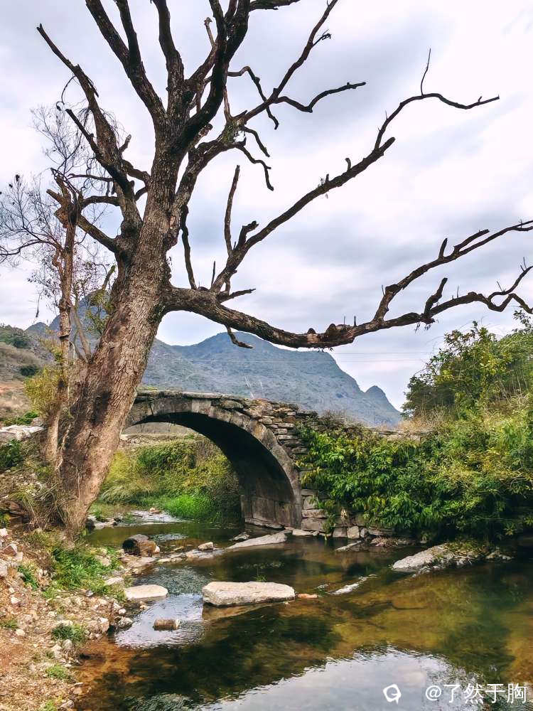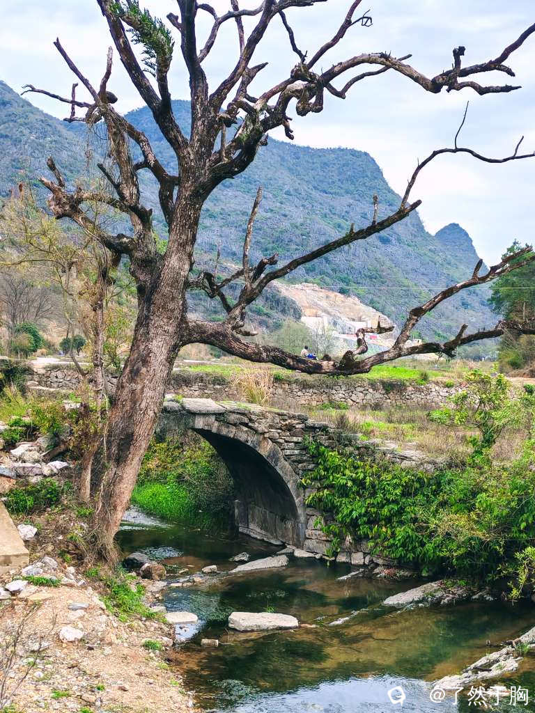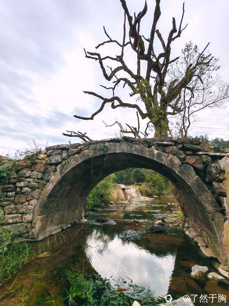 村前的古道虽已消失,但吕竹水上的古道石桥却依旧在。古桥不大,是一座单拱石桥。桥头的古樟已枯死,但现在又从根部处长出了两枝小树干,已有一人多高,展示出了其强劲的生命力。