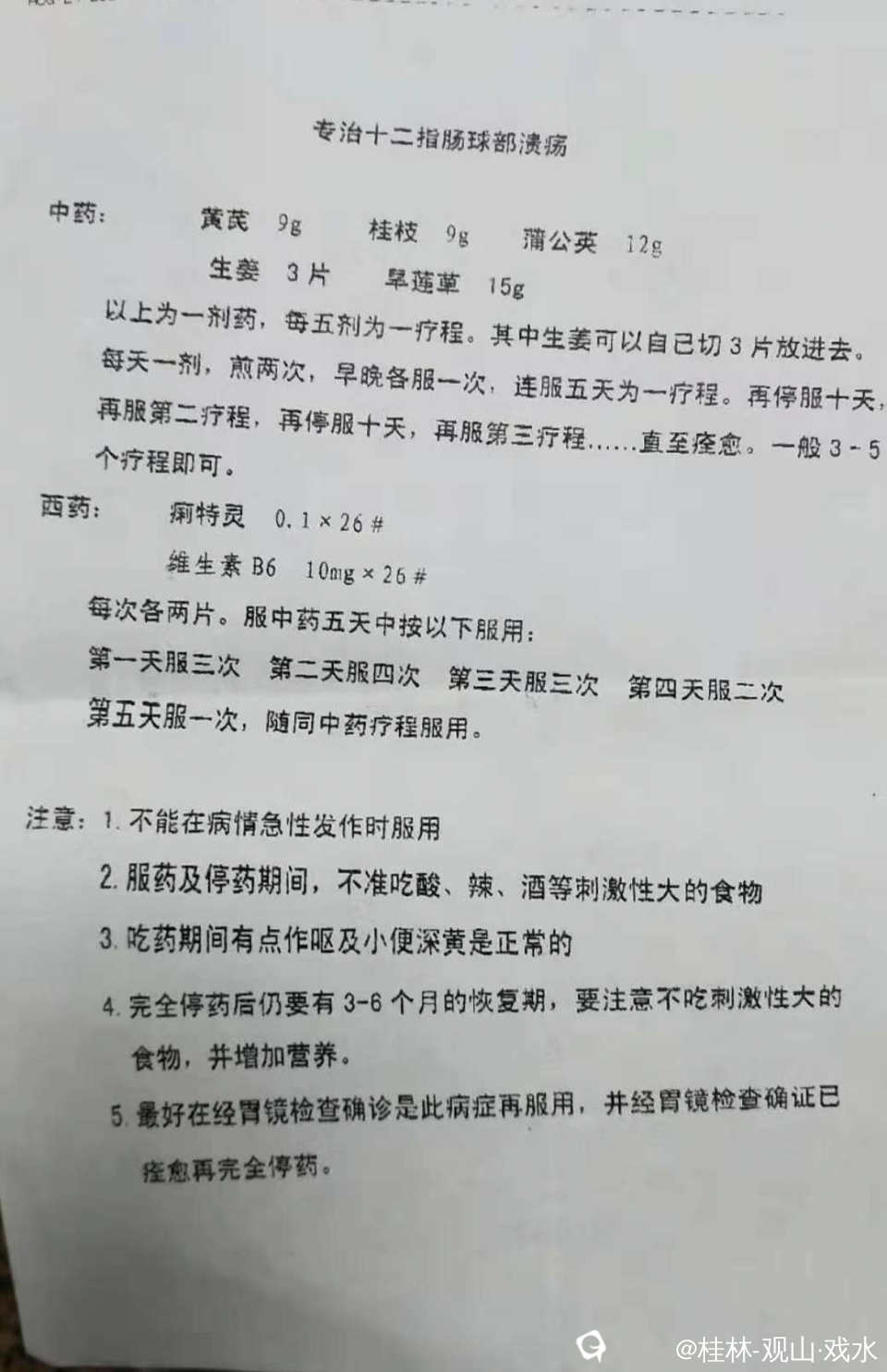 上周,碰到一位老工友,问我还保存有治胃偏方么?说他得了十二指肠球部疡。我说,应该有,帮你找找看。电脑可能坏了,无法打开(也好久不用了)。想想,虽然手机换了新的,不知原先收藏里还在不在?一路找下去,终于找到了。记得90年代初某天,走过车库。车队长问我,你怎么嘴唇乌乌的?是不是病了?我说前几天胃不舒服,这两天好了,但大便有点黑。他说你可能胃出血啦,赶紧到医院看看。去了当时工人医院(现二医,湘雅二医分院)确诊十二指肠球部疡,胃出血。一周稳定后出院。医务所所长给了我这个偏方,说,你可以试试。询了单位几个用过此偏方的老师傅,都说效果很好。于是,去西凤路抓了中药(当时才一两毛一副)医务所要了西药,严格按方执行。三个疗程后,为验证,专门又去医院做了胃镜。医生说,你的疡面基本长平了,蛮光滑呀。虽然当时闻到煮药味就有点想吐了,为巩固疗效仍继续坚持了两个疗程(一共五个疗程)才停药。又保养了半年,才正常吃东西。此后什么酸的,辣的,酒(应酬,少量。本来就没什么酒量),冷饮照吃不误。只是这几年,人老了,机能差了,时不时又有胃炎了。却也不想那么折腾了。但这个专治十二指肠球部疡的偏方,还是保了我二十多年的好胃。现供出来,喜欢者取之,不信者弃之。谓之偏方,自然不入大堂,宜慎用,遵医嘱。供方者,不负任何责任哈!