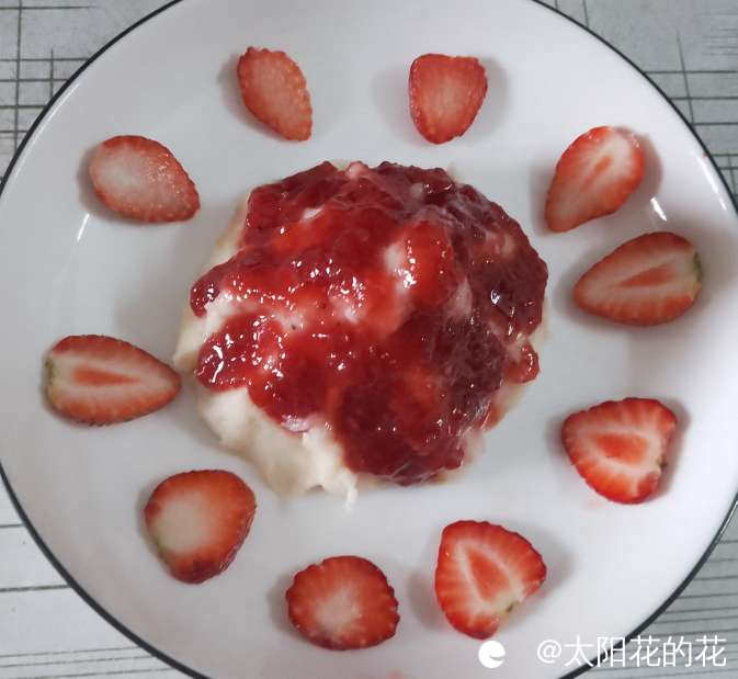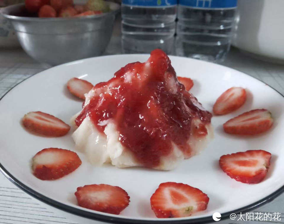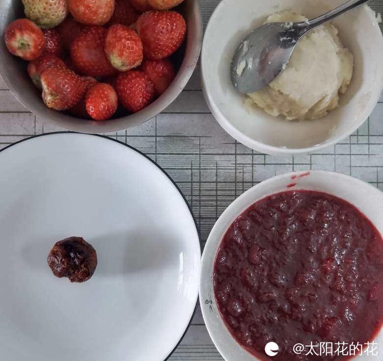 这是今天的战果,太熟的草莓不好放,熬成草莓酱放着夹馒头或者吐司吃,前几天看到一个人用山药泥和蓝莓酱做冰淇淋吃,我也试试用草莓酱和山药泥做成冰淇淋的样子给小朋友吃…………