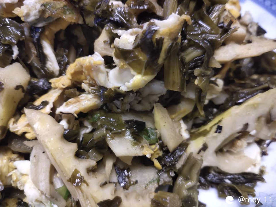 酸菜炒干水,竹笋过水撩过,炒干水,鸡蛋用油爆香成形,成碎状,再加油,把酸菜,竹笋,鸡蛋,一起搅拌炒香,加适量的盐,即可出锅。