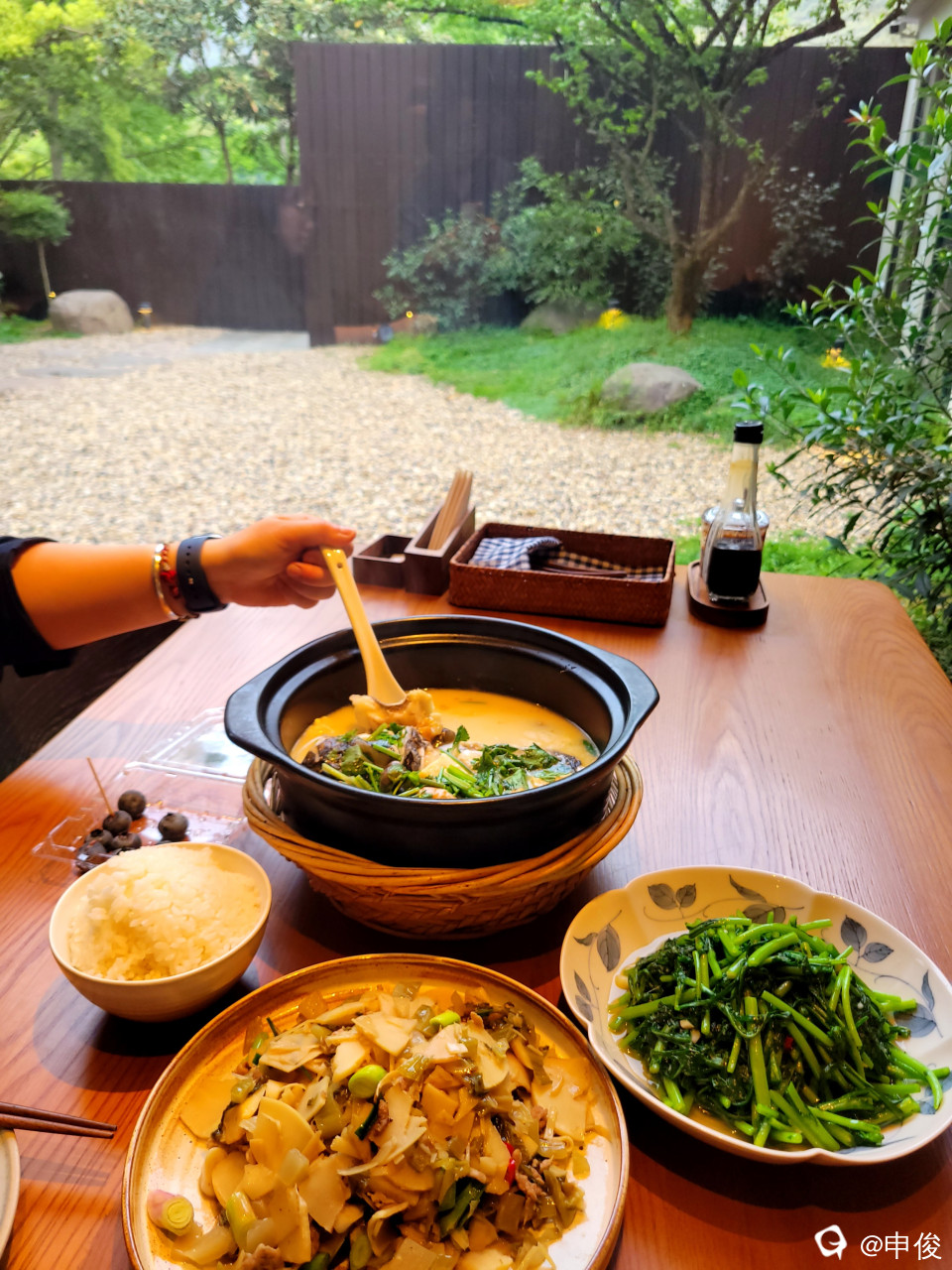 春江鱼头煲汤汁浓郁,原乡包头鱼、虾、豆腐、螺蛳、香菜好味,蔬菜是茼蒿和春笋都好吃