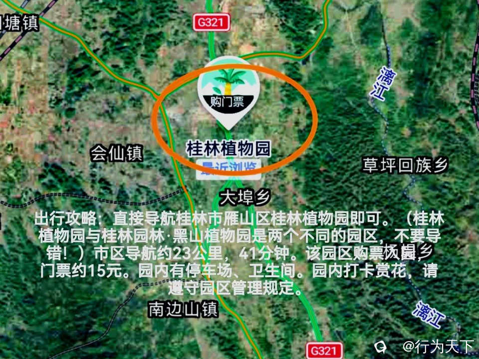 出行攻略:直接导航桂林市雁山区桂林植物园即可。(桂林植物园与桂林园林·黑山植物园是两个不同的园区,不要导错!)市区导航约23公里,41分钟。