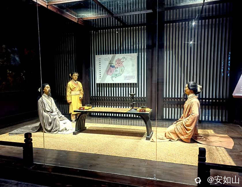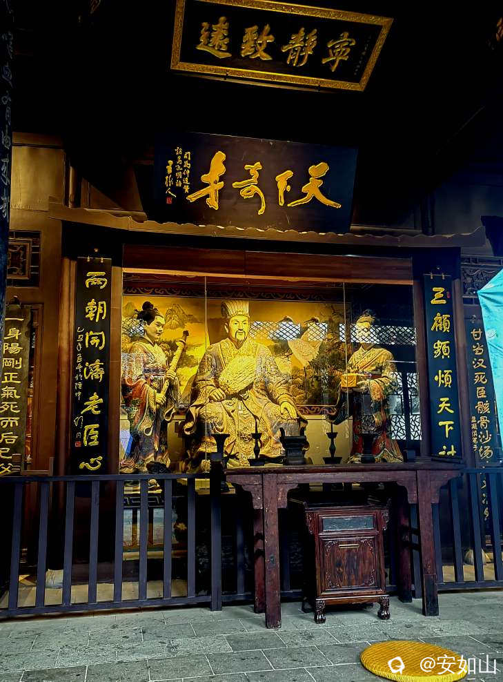 刘备三顾茅庐请诸葛亮出山,聊美一统三国兴汉大事,在三国故事中称为隆中对话,三顾堂就是为纪念此事而建的堂馆,三顾堂内刘备与诸葛亮席地对坐,共商谈兴汉大计,庭院里关羽,张飞屋外等得焦心,庭院外刘,关,张马匹拴在高大的柏树下,三顾堂很逼真的还原了当时的场景