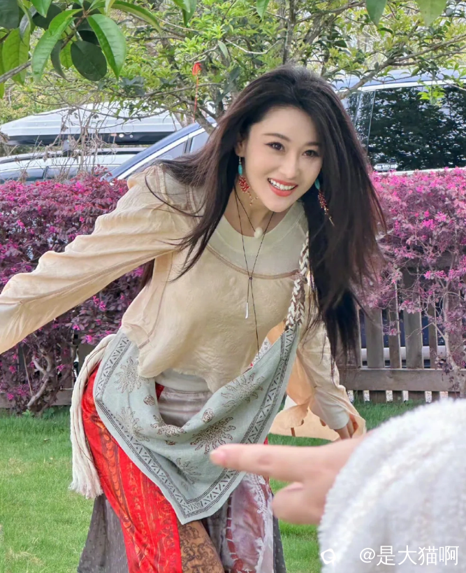 张馨予披着一头长发,身穿米色拼接上衣搭配民族风拼接半裙,一身个性十足的打扮既显异域风情又不失时尚感,加上高颜值和好身材,真的好美。她面带灿烂笑容,扑面而来就是满满的惊艳,整个状态魅力十足。