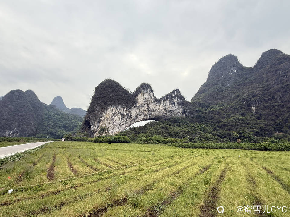 平乐青龙月亮山,喀斯特地貌的鬼斧神工。山呈东西走向,横跨在稻田之上,中部镰刀形镂空,近乎占据全山三分之一 ,穿孔跨度约60米,内径高约40米,是桂林平乐8大穿山中跨度最大、造型最秀的一座,被当地推为月亮山之首。站在不同角度,你会看到它或似虹桥飞架,气势磅礴;或像一轮硕大弯月,高悬碧空;山顶三峰相连,又如同天然笔架,难怪也被叫做“笔架山”。在这里,自然的壮美与田园的悠然完美交融,随便一拍都很出片。