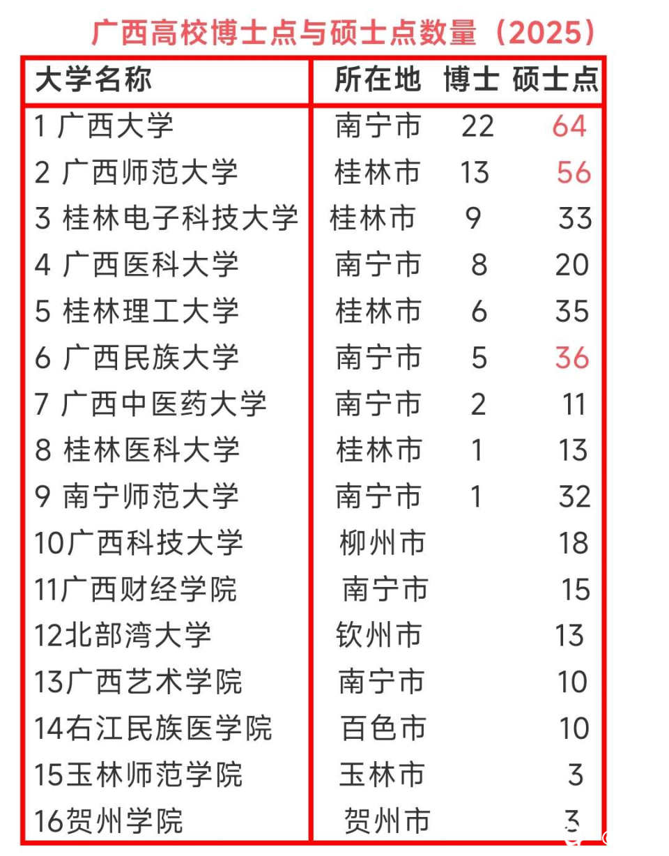 广西9所高校有博士点,16所高校有硕士点,南宁5所桂林4所。