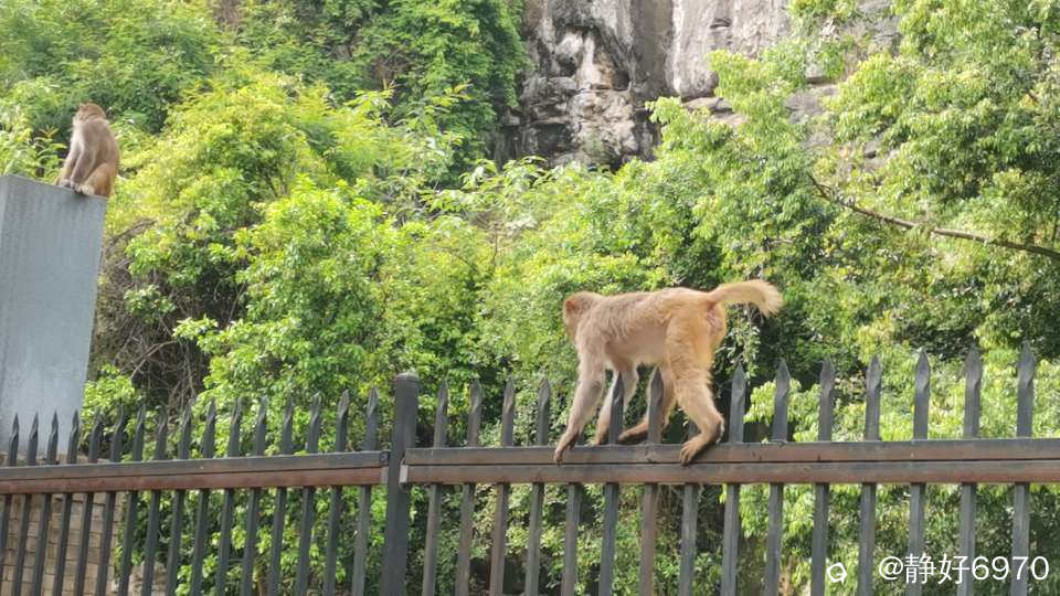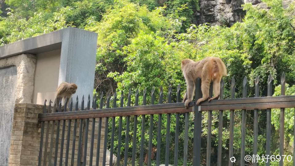 这些猴子也知道不跑出栅栏来,都在栏杆上走来走去,要知道铁栏杆上面都是倒立三角形,比较锋利,避免外人爬进去,只见猴子经过时小心翼翼,一步一步的慢慢挪过去。把我看的心惊胆跳,生怕它们不小心戳破肚皮。还好有惊无险,看着他们安然无恙的走过去。