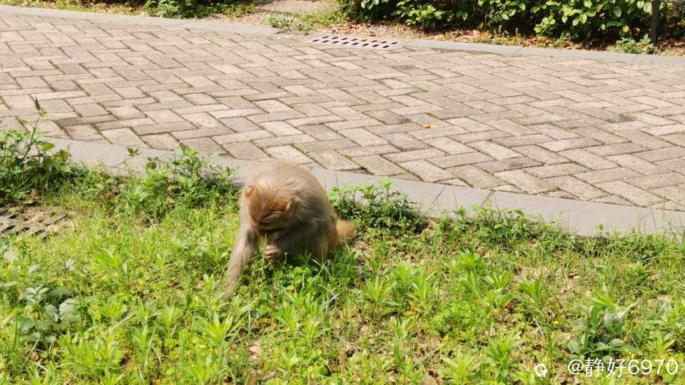 开始我不敢走近围墙,一是怕吓着它们,二是怕它们过来抢东西。这时我见路人甲都走近去拍照,我也慢慢靠近,把手机伸到栏杆里去拍。下图一的猴子在吃草,只见它抓起一把把的草往嘴里塞,可惜路过没带点吃的,下次专门买点香蕉去喂它们。