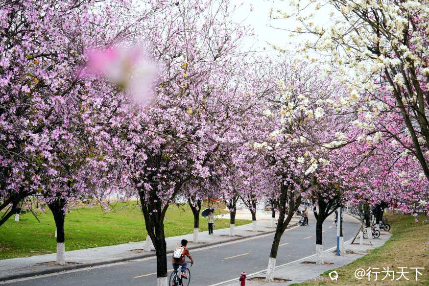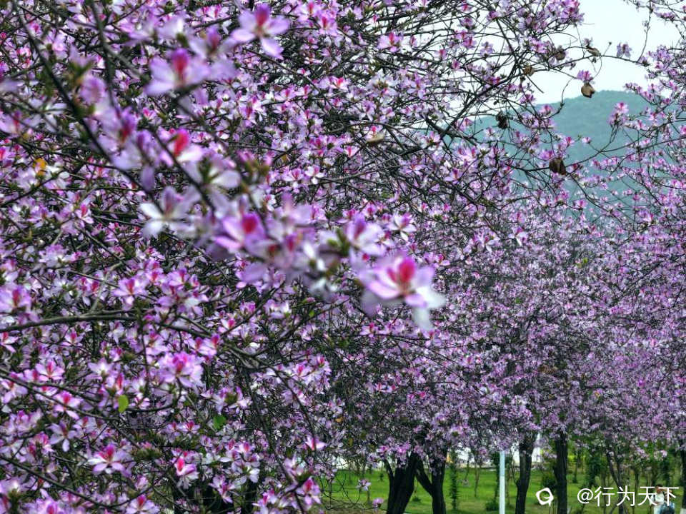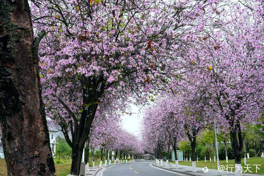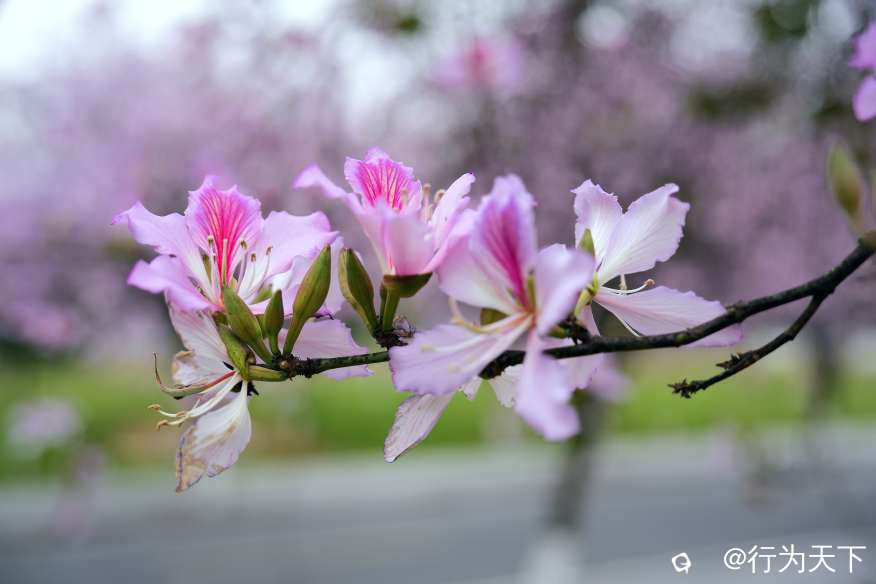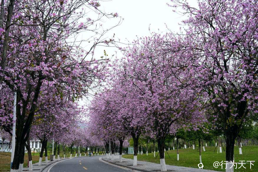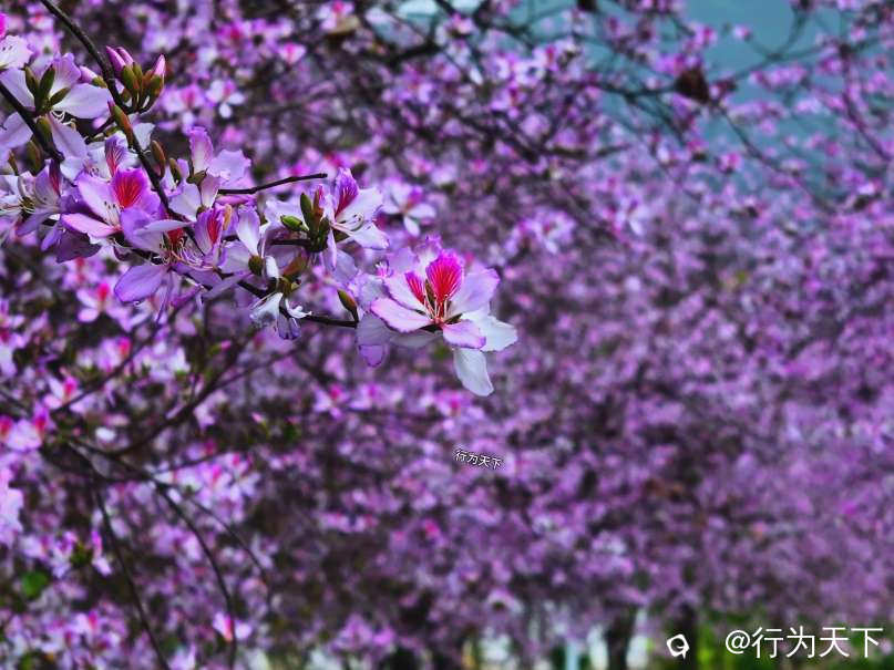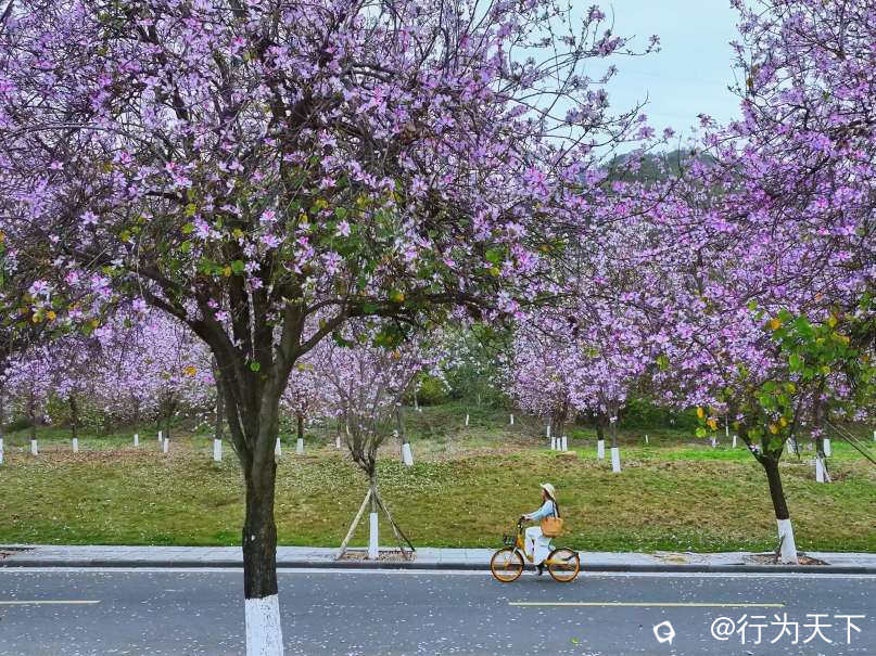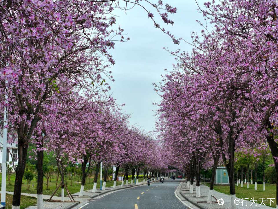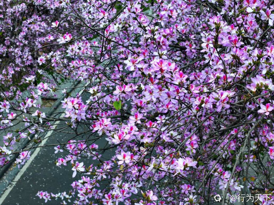 紫荆花盛开时,粉紫色的花朵缀满枝头,宛如一片梦幻的云霞,将整条道路染成绚丽的色彩。