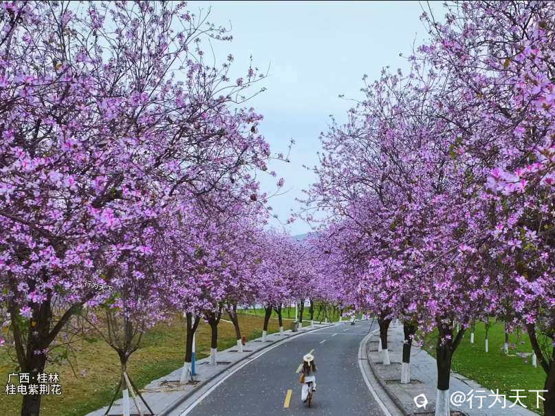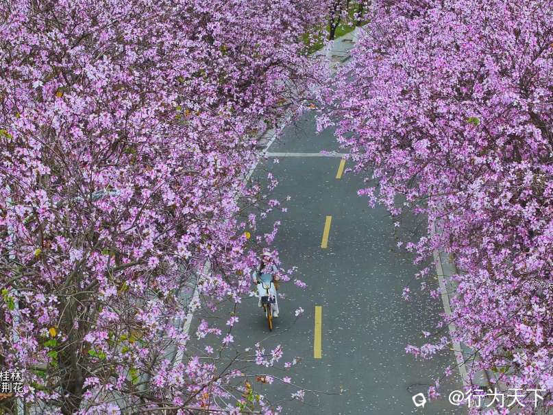 当紫荆花盛开时,整条大道仿佛被赋予了生命,花瓣飘落,宛如时光的碎片,轻轻诉说着校园里的故事。无论是晨光中的朗朗书声,还是夕阳下的匆匆背影,都与这片花海共同构成桂电独特的风景。