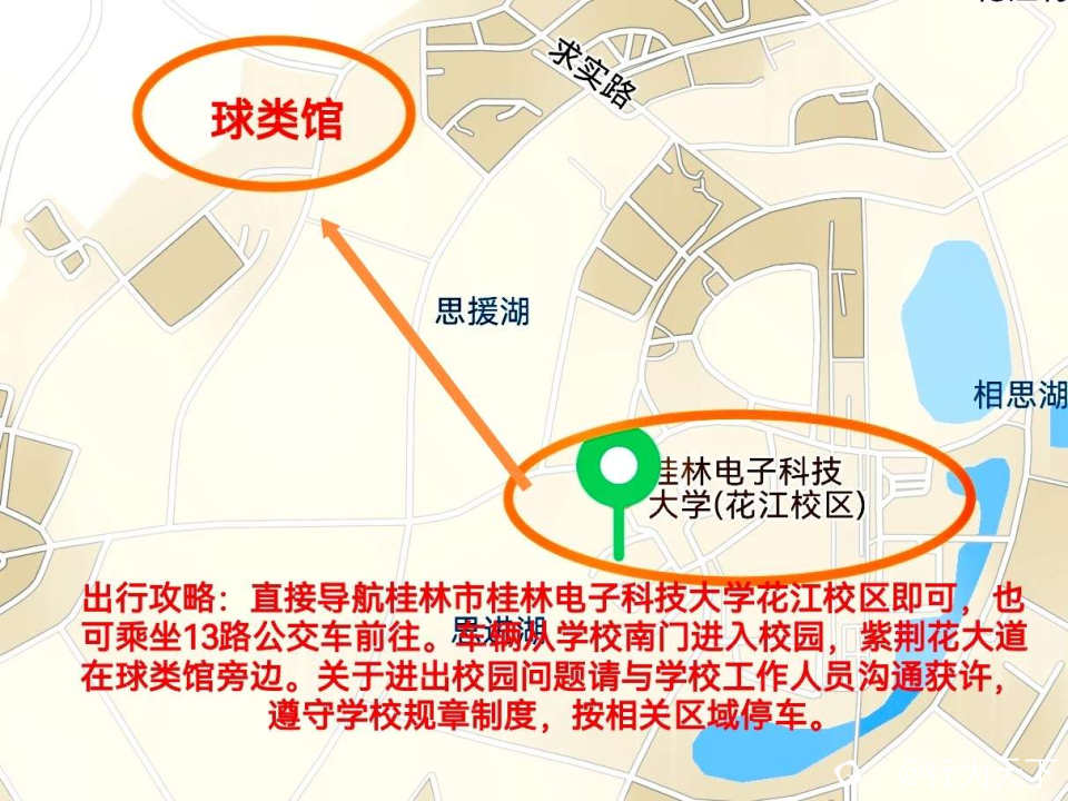 出行攻略:直接导航桂林市桂林电子科技大学花江校区即可,也可乘坐13路公交车前往。车辆从学校南门进入校园,紫荆花大道在球类馆旁边。