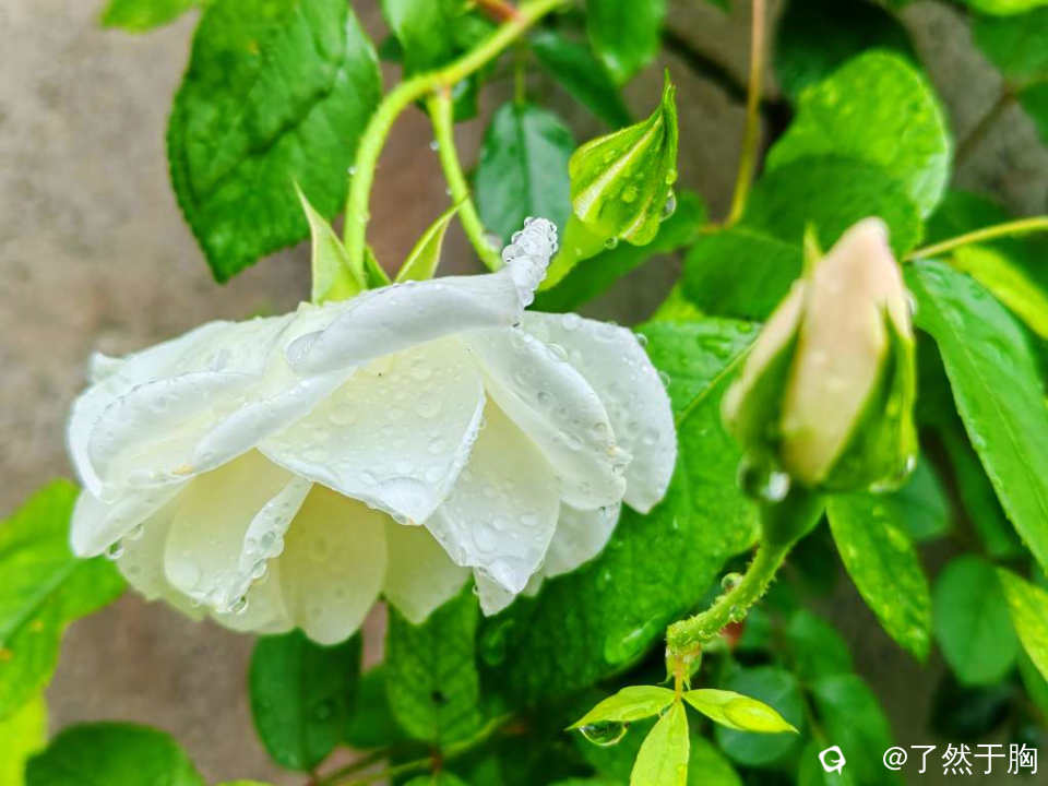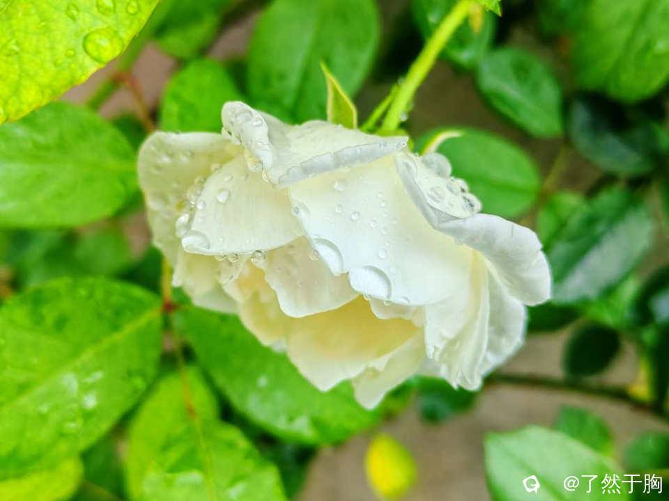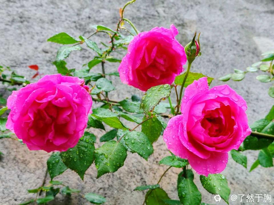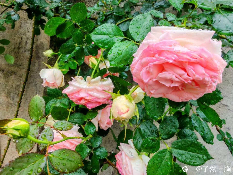 灵川县灵西路上的月季,品种多,色彩斑斓。花朵及叶片上,含珠带露,更显娇媚迷人。