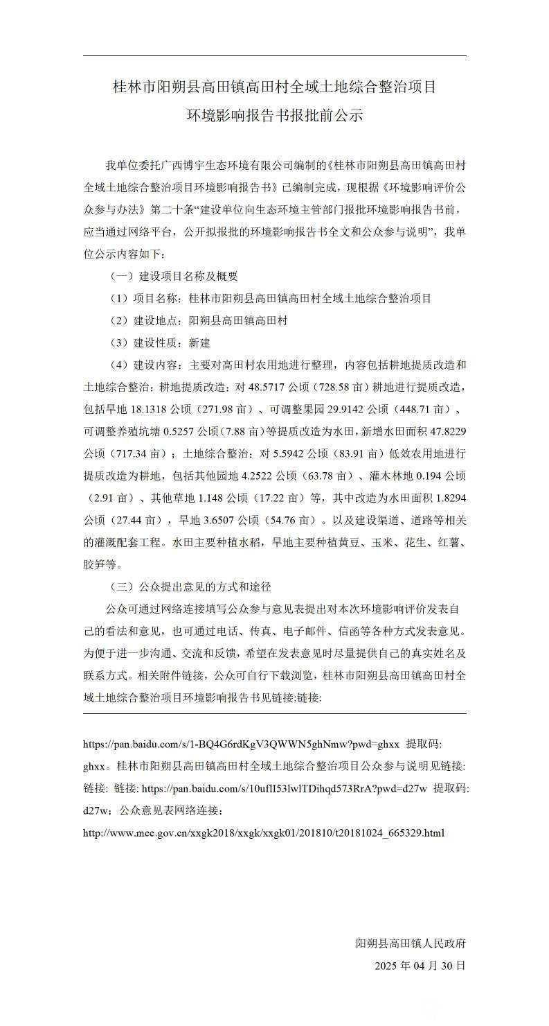 [新闻爆料] 桂林市阳朔县高田镇高田村全域土地综合整治项目环境影响报告书报批前公示