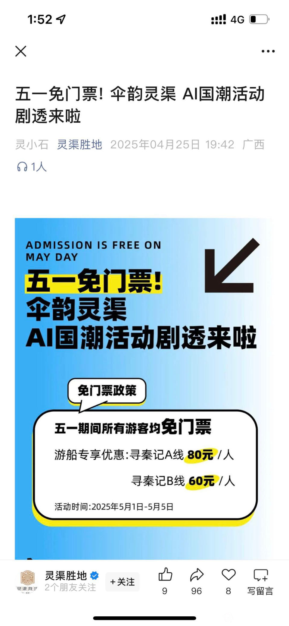 在微信推文上看到的消息,五一灵渠免门票!走过路过不要错过啊!