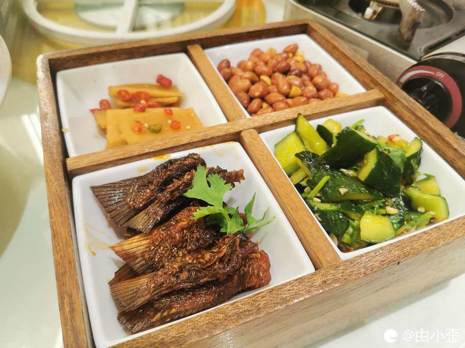 炭炉烤香辣鱼尾、私房爽口萝卜皮、五香酥脆花生米、蒜泥香辣拍黄瓜,木盒子里的四件套,还是太饿了,每样都来一点。