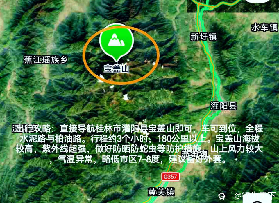 出行攻略:直接导航桂林市灌阳县宝盖山即可,车可到位,全程水泥路与柏油路。行程约3个小时,180公里以上。宝盖山海拔较高,紫外线超强,做好防晒防蛇虫等防护措施。