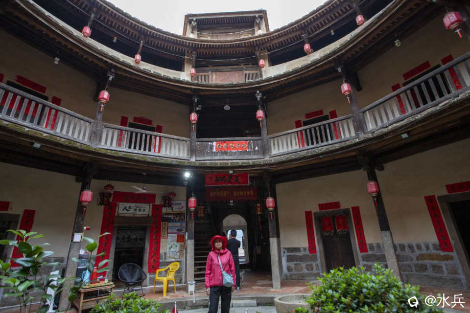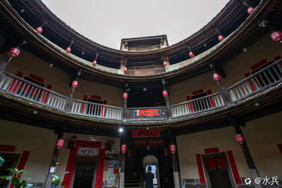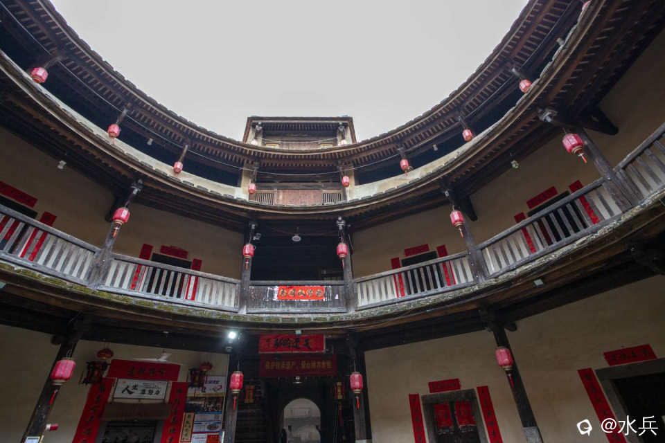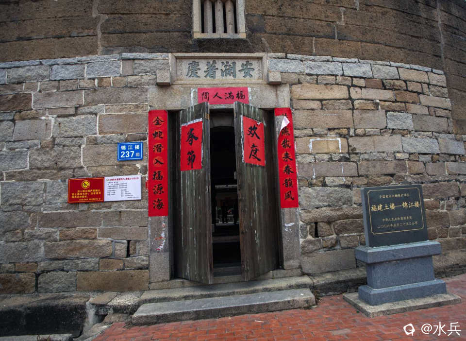 锦江土楼- 建筑概况:建于清乾隆五十六年(1791年),由林升泽始建内圈,其妻李灿于嘉庆八年(1803年)续建中圈,清中期后世续建外圈。为内高外低三圈内通廊式圆形土楼,内圈平面直径25米,高三层,主楼四层;中圈平面直径42米,高一层;外圈平面直径58米,均为平房。 - 建筑特色:采用条石和三合土混合夯筑,墙体坚固,历经二百多年仅出现数处轻微裂缝。内高外低的布局在闽西南土楼中独一无二,从外到内一环比一环高,远看如金字塔。