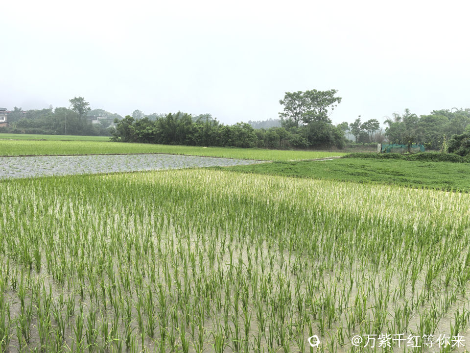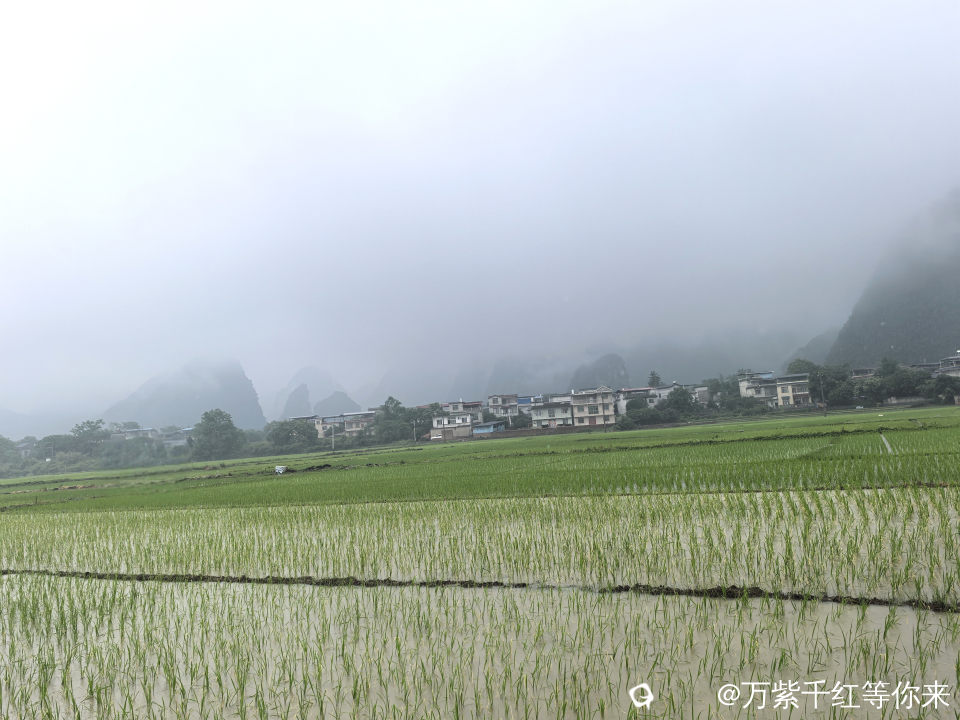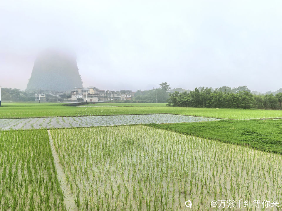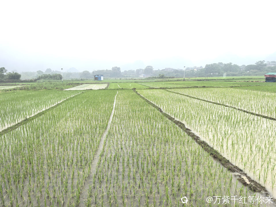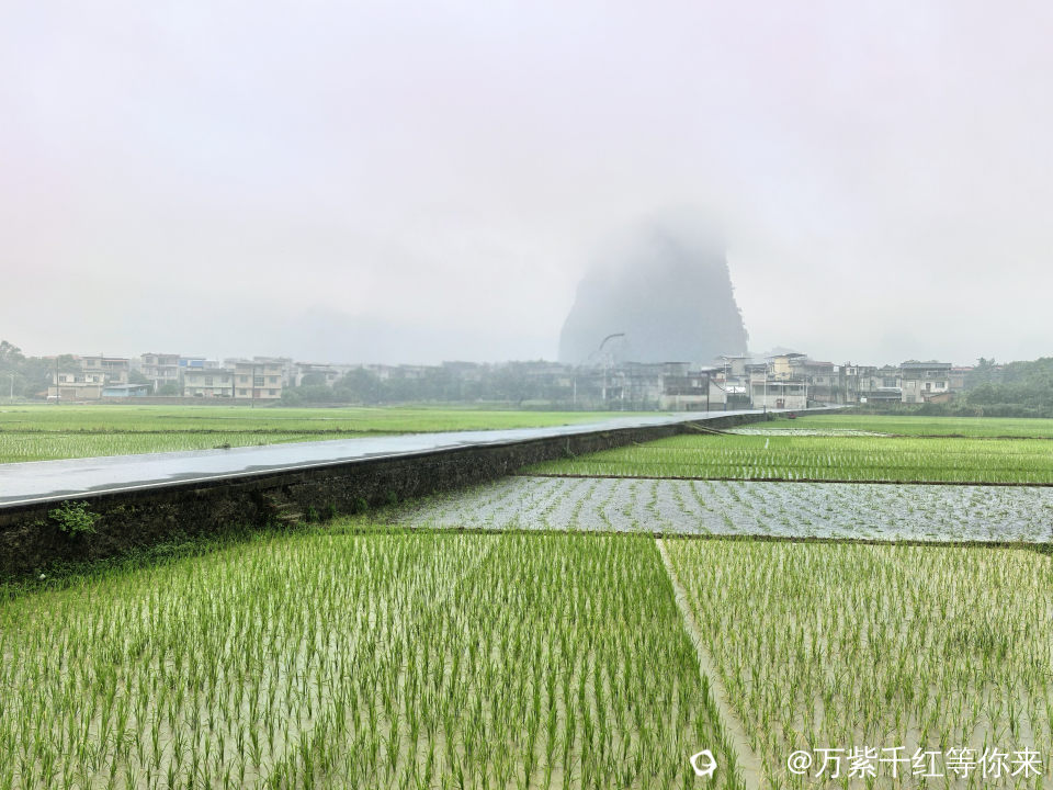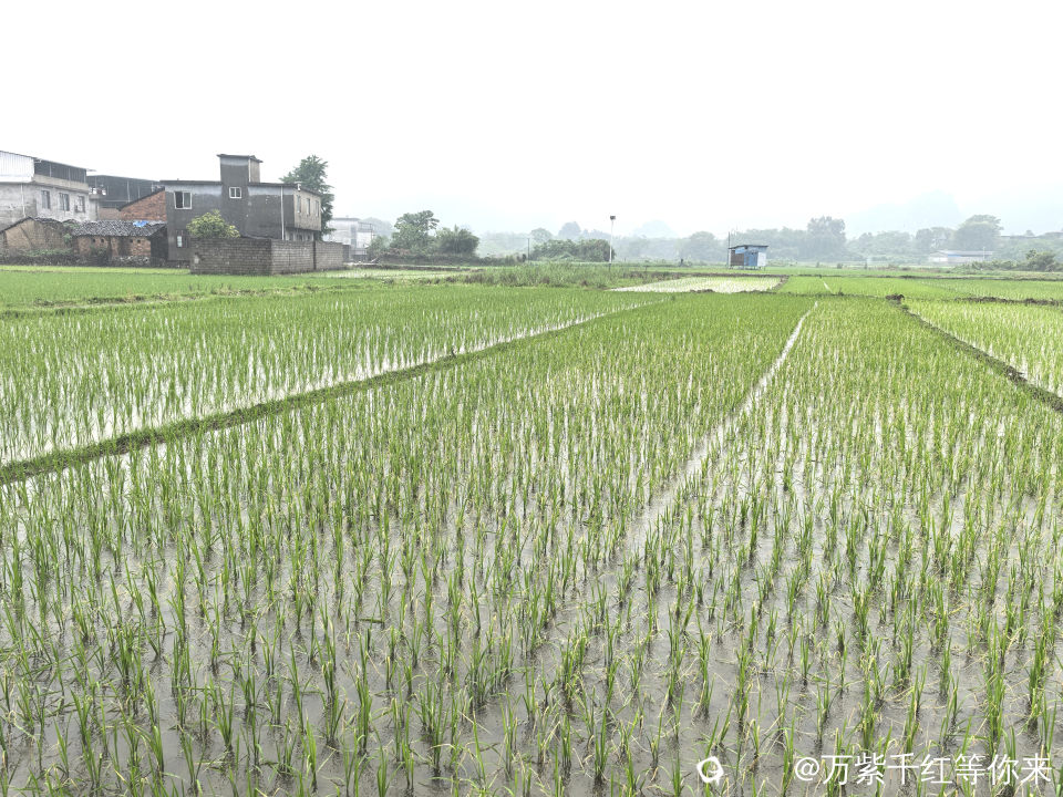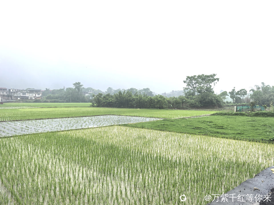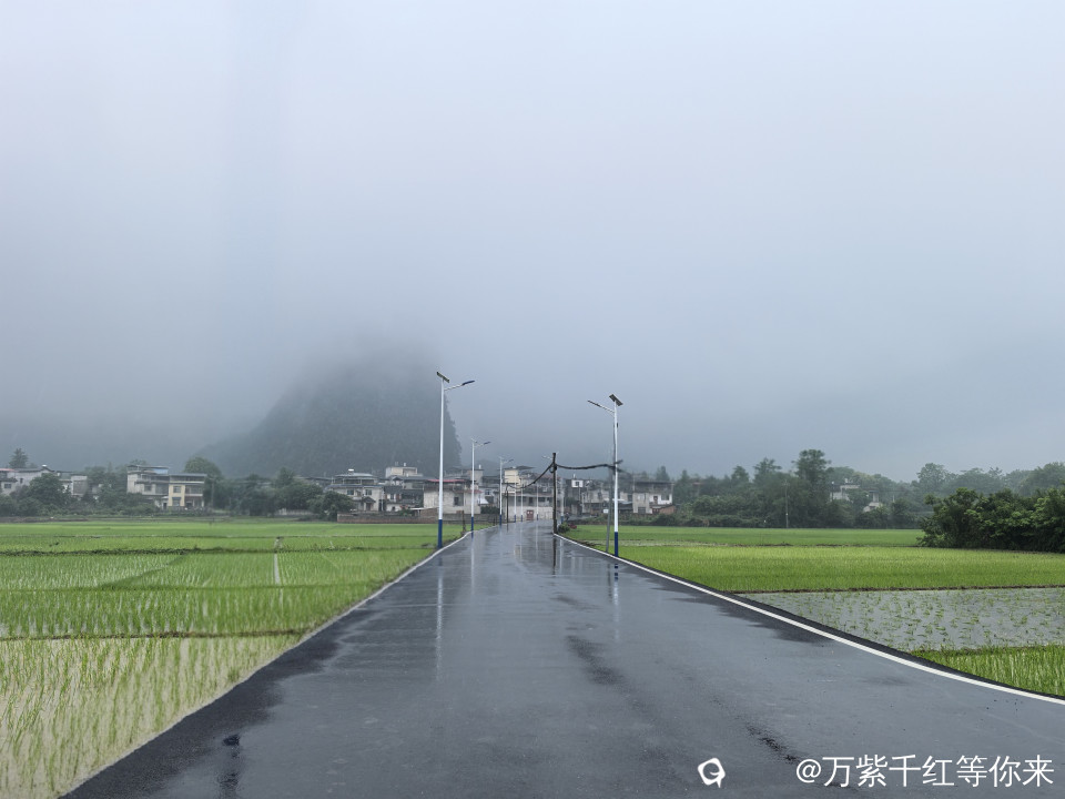 车子驶入村里,乡道两旁的田园景色,也变成了雨中仙境。