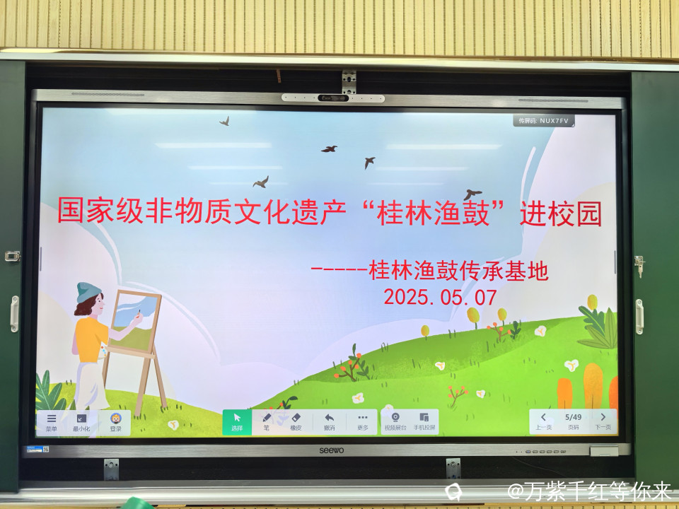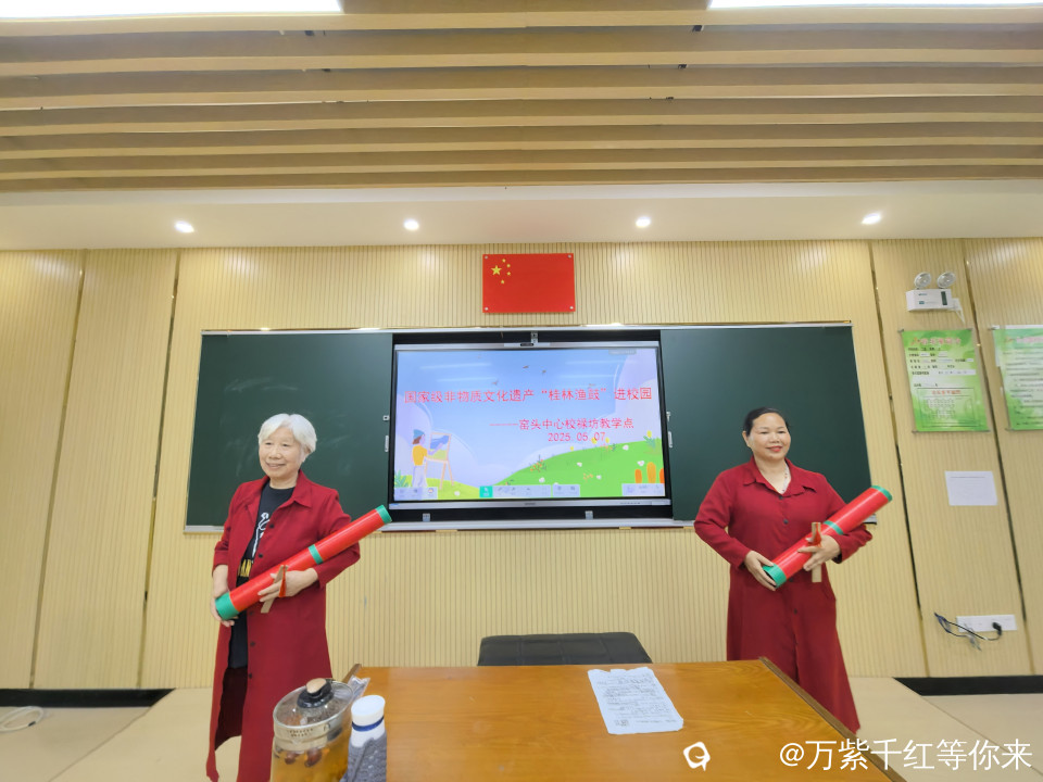 今天早上,桂林渔鼓传承人彭承红老师,带领她的团队冒着暴雨,走进桂林窑头中心校禄坊村小学义务传授渔鼓文化。望着车窗外的瓢泼大雨,比豆粒还大的雨点打在前挡风玻璃上,发出了噼里啪啦的声响;虽然暴雨一直都在下个不停,但丝毫不影响她们给学生辅导渔鼓的热情,正因为有这份责任与担当,她们坚持了十几年。