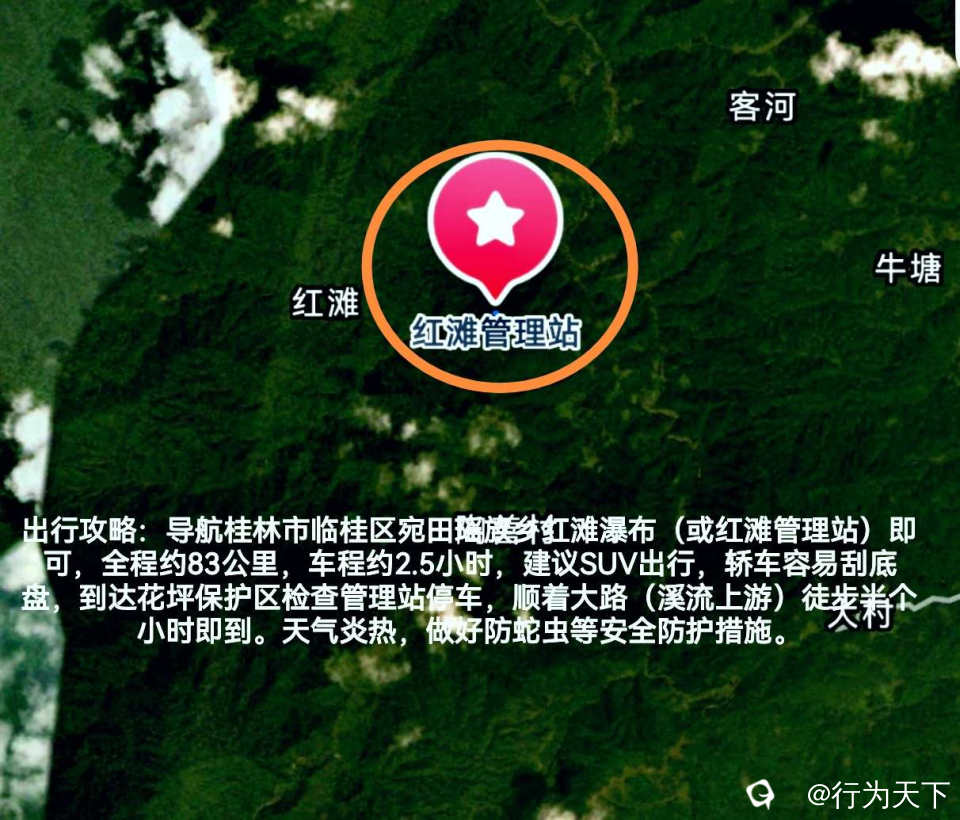 出行攻略:导航桂林市临桂区宛田瑶族乡红滩瀑布(或红滩管理站)即可,全程约83公里,车程约2.5小时,建议SUV出行,轿车容易刮底盘,到达花坪保护区检查管理站停车,顺着大路(溪流上游)徒步半个小时即到。