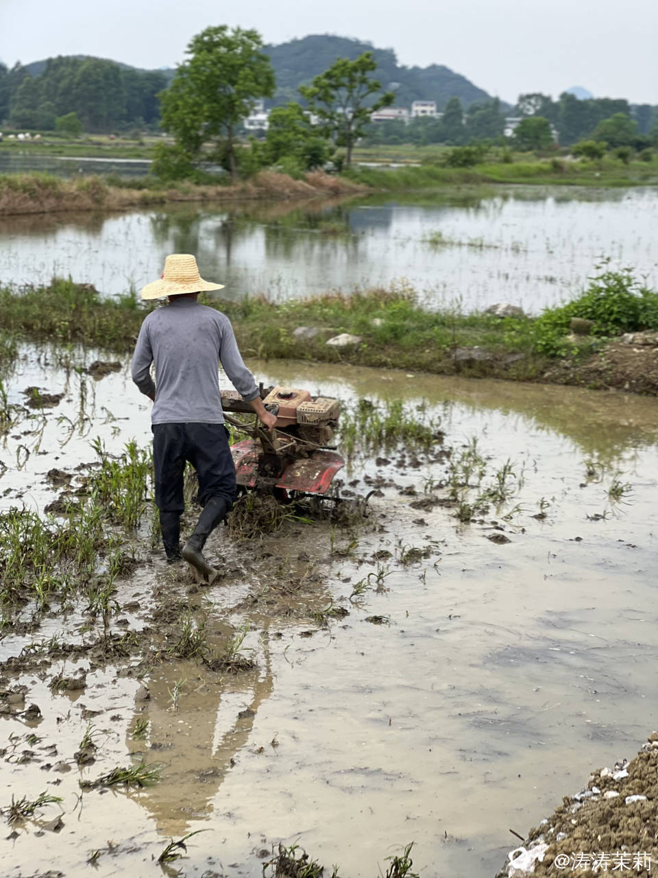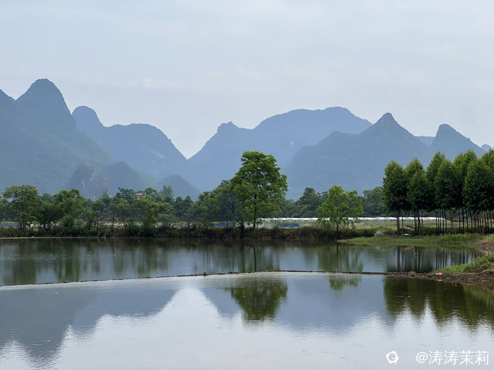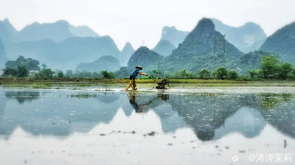 因为下雨过后田里蓄满了水,水里的倒影跟远处的山交相辉映,真是太美了!