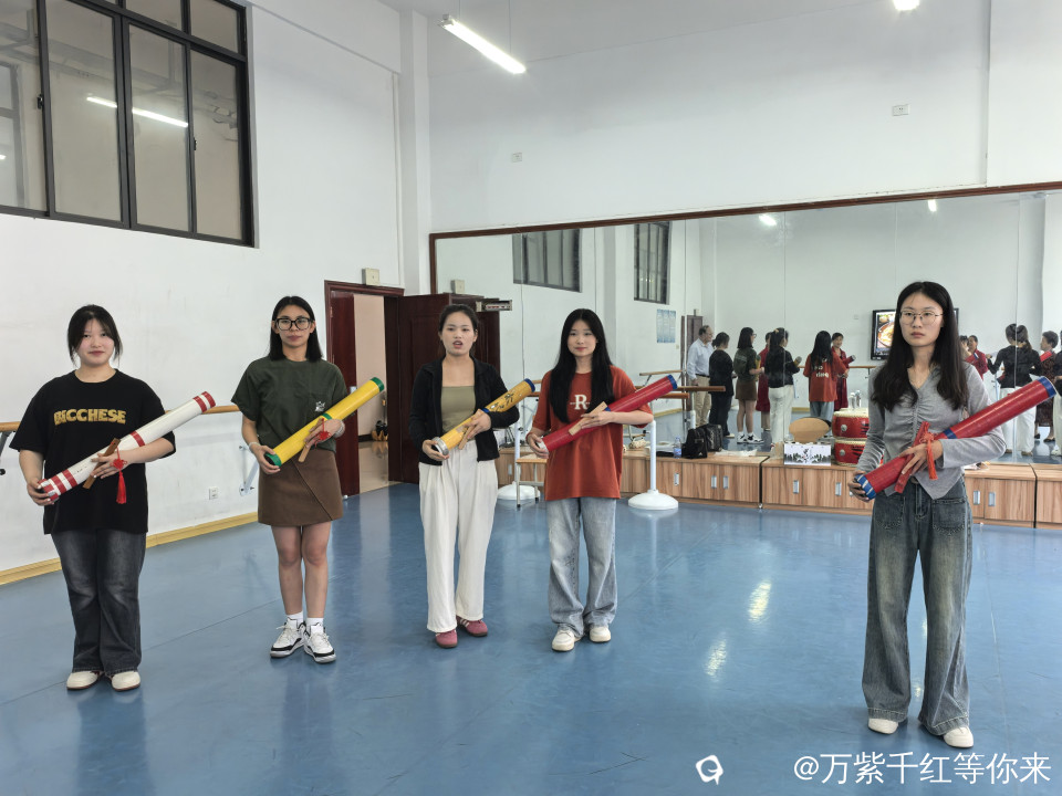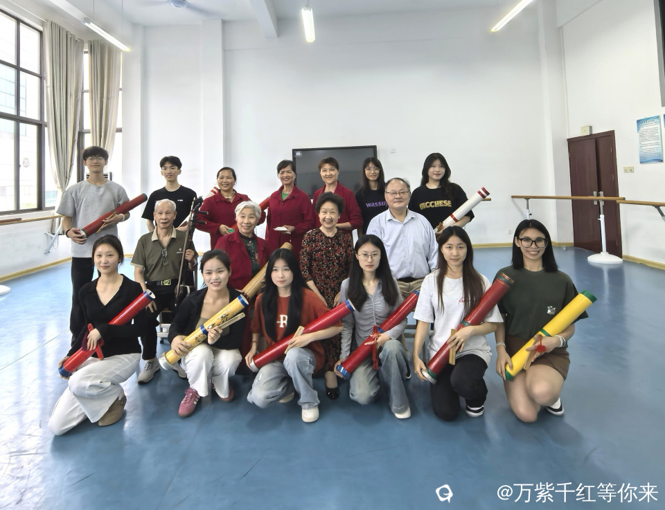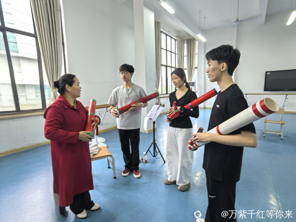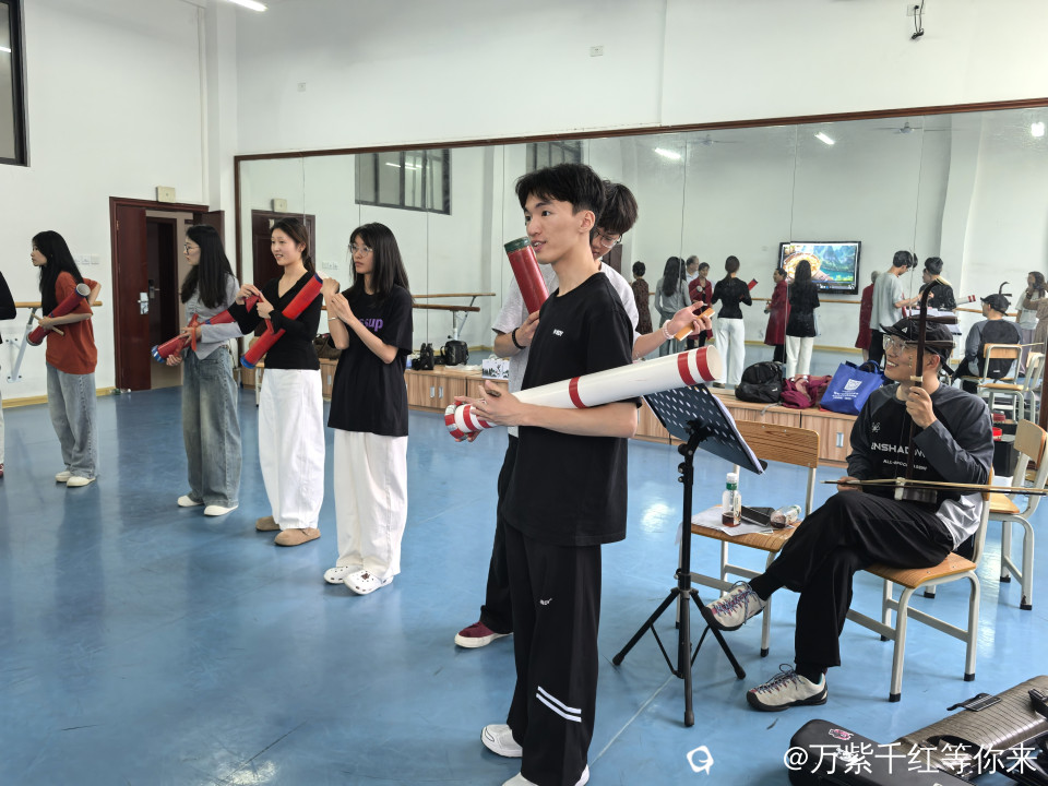 天空阴沉沉的还时不时飘着小雨,我们一行人乘车缓缓驶入校区,受到了音乐系领导及同学们的欢迎。国家级桂林渔鼓传承人李蔚琛老师、自治区级传承人彭承红老师,及渔鼓传承基地的老师,把非遗文化推广进校园;她们怀揣着对渔鼓的热爱和传承的责任,积极投身到校园教学。