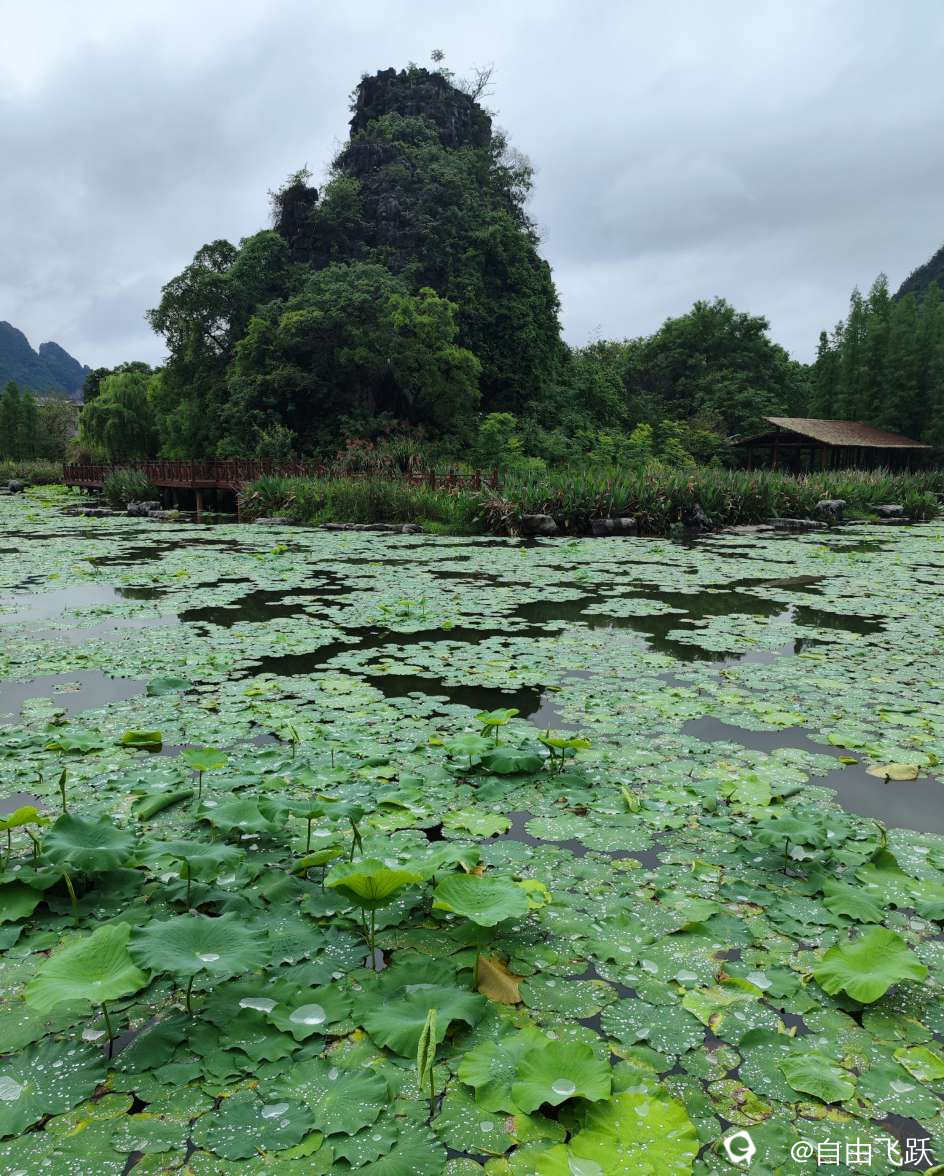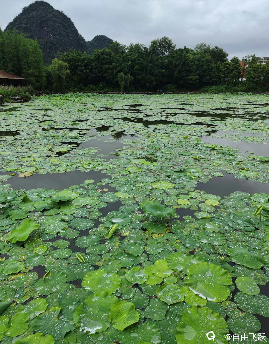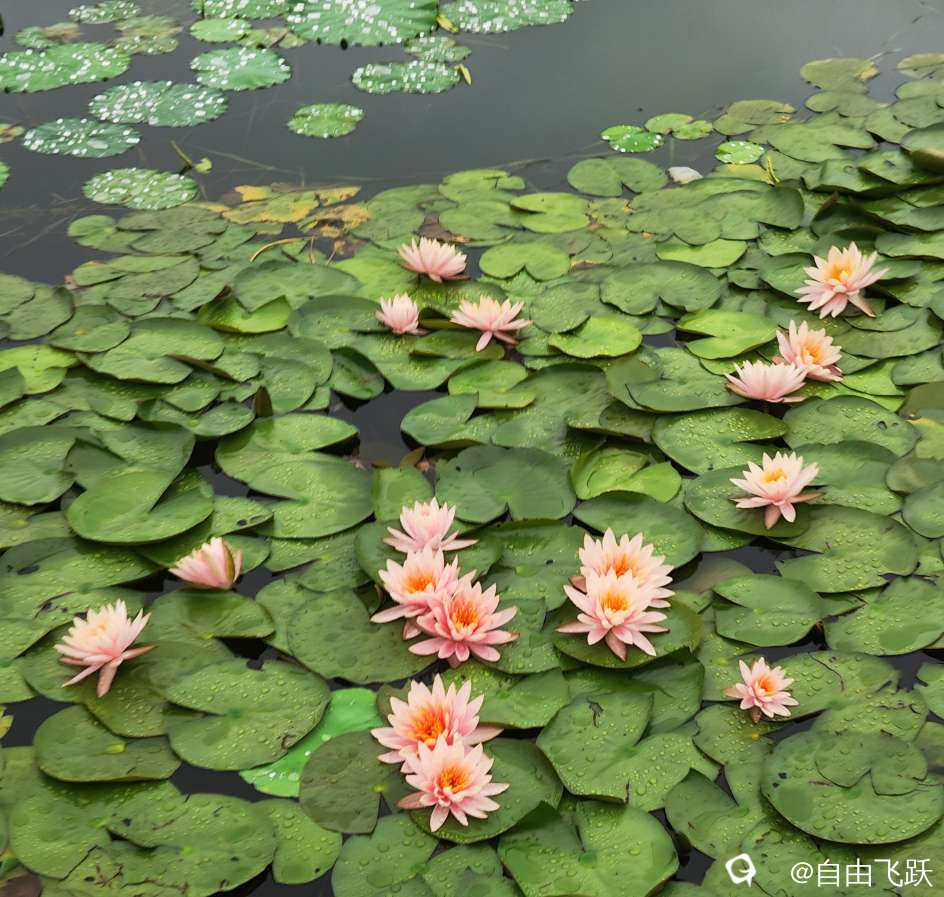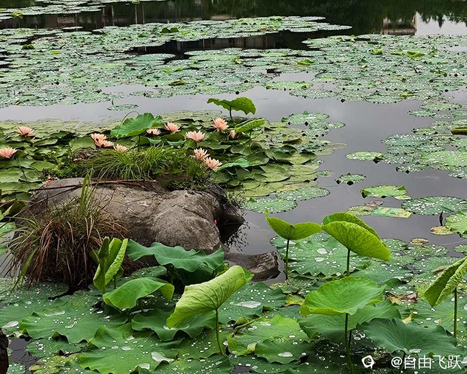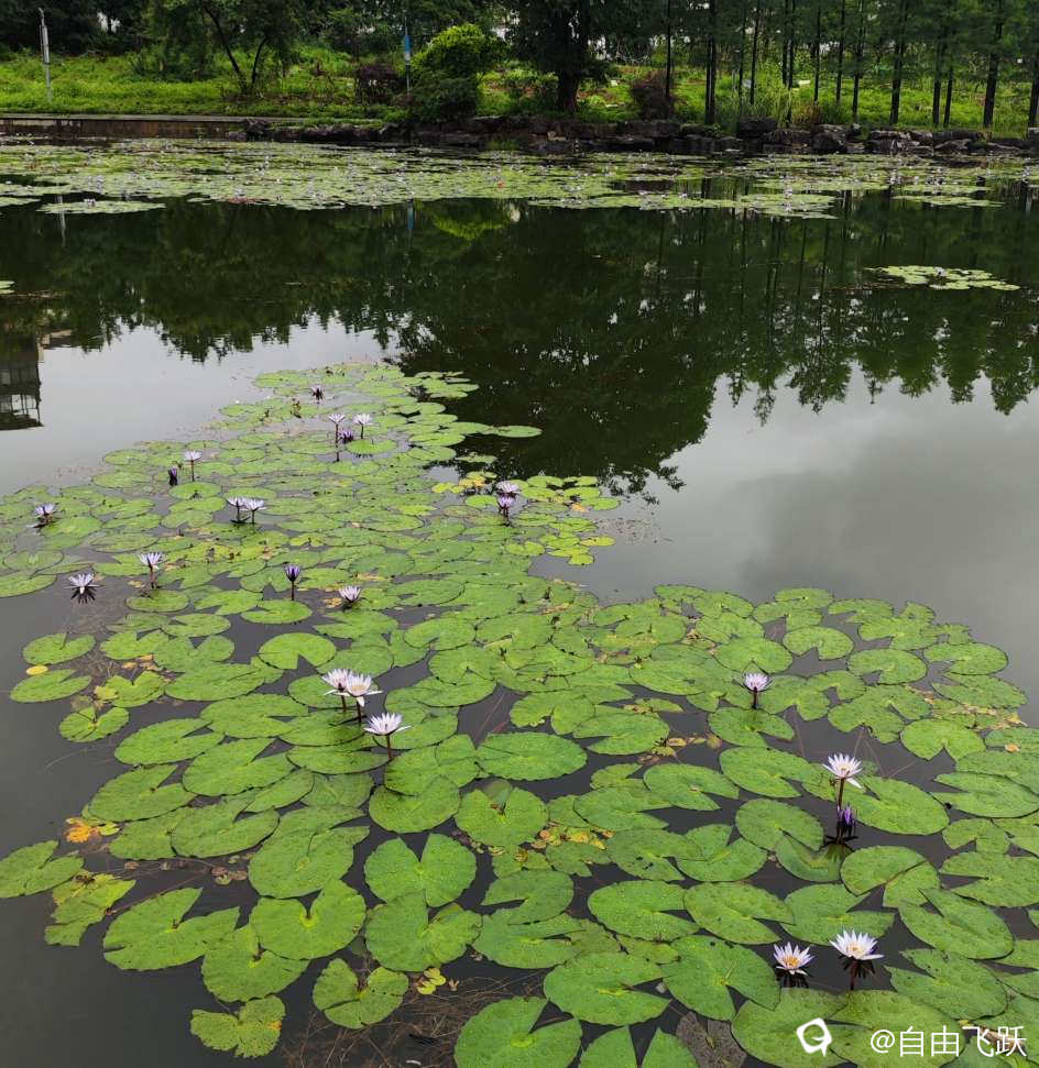 有人说,世界第一美的睡莲是法国莫奈花园的睡莲,今天来到这湖边,看见雨后的湖中一片片睡莲千姿百态绚丽多彩,觉得相比莫奈花园的睡莲应该也不相上下,甚至因为花瓣上滚动的雨滴珠光闪耀而更胜一筹,那是再大的画家也画不出来的景色。